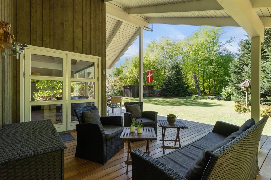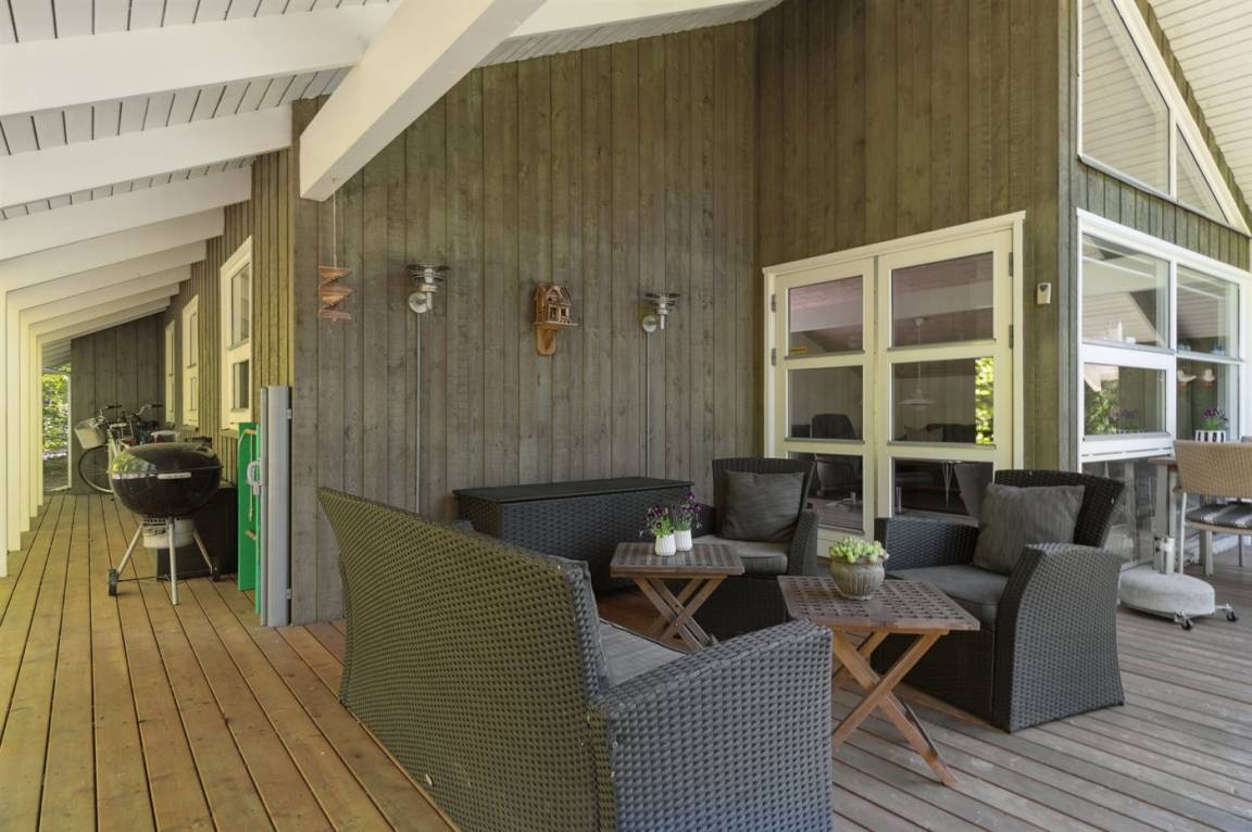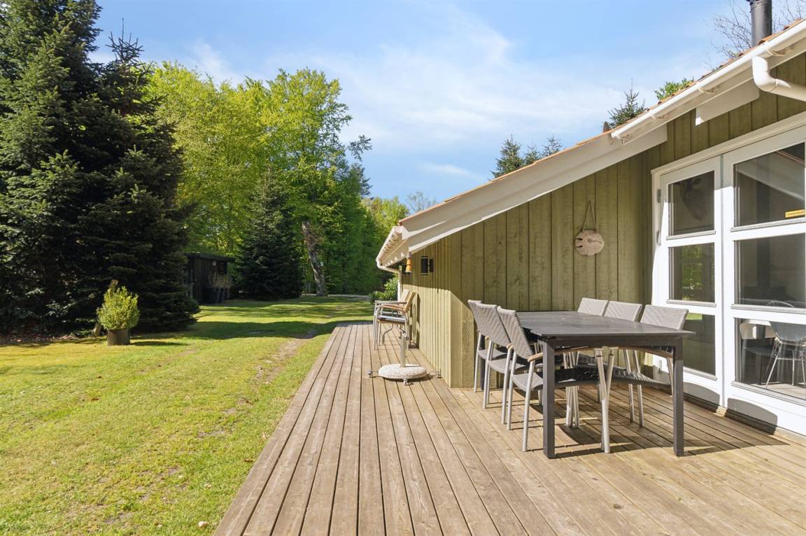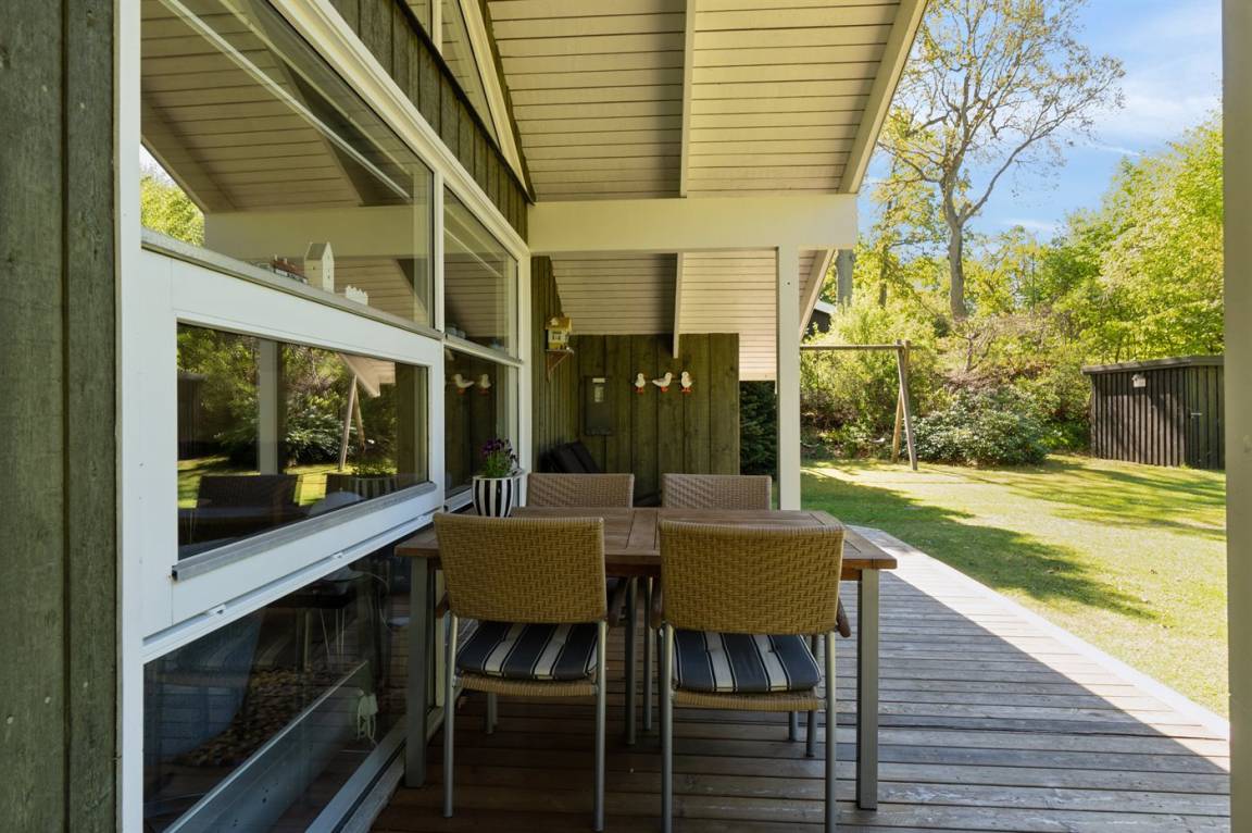 Das Ferienhaus liegt völlig ungestört auf einem großen, schönen Grundstück, von dem aus man einen guten Überblick über den Garten hat, während die Kinder spielen. Von der großen, teilweise überdachten Terrasse aus kann man die Sonne den ganzen Tag über genießen und immer einen windgeschützten Platz finden – hier kann man die Ruhe in vollen Zügen genießen.