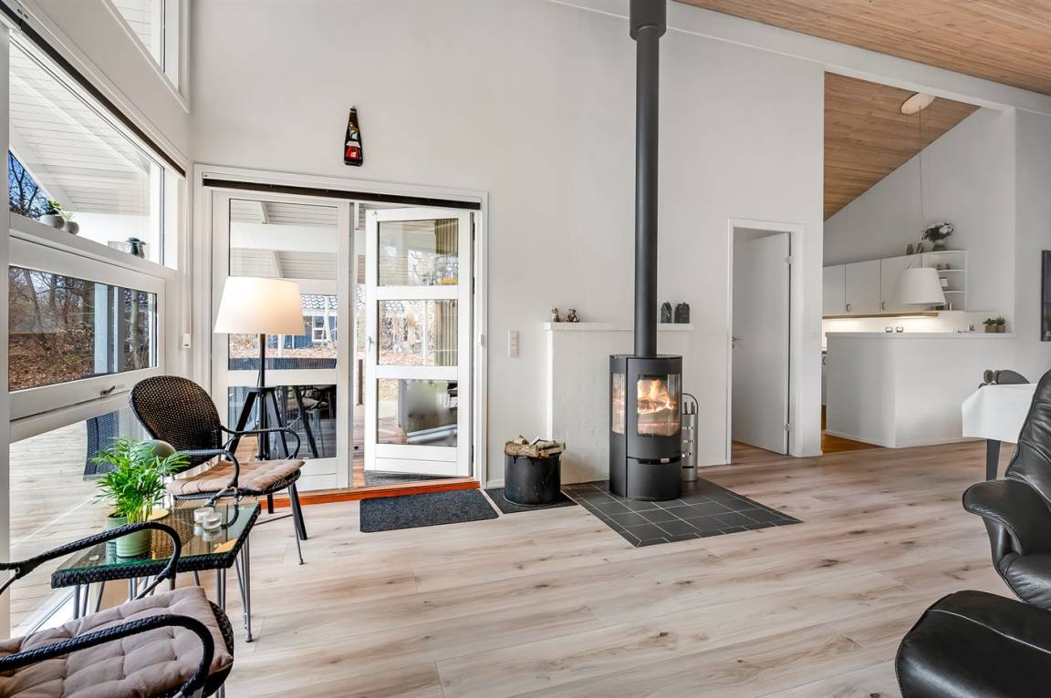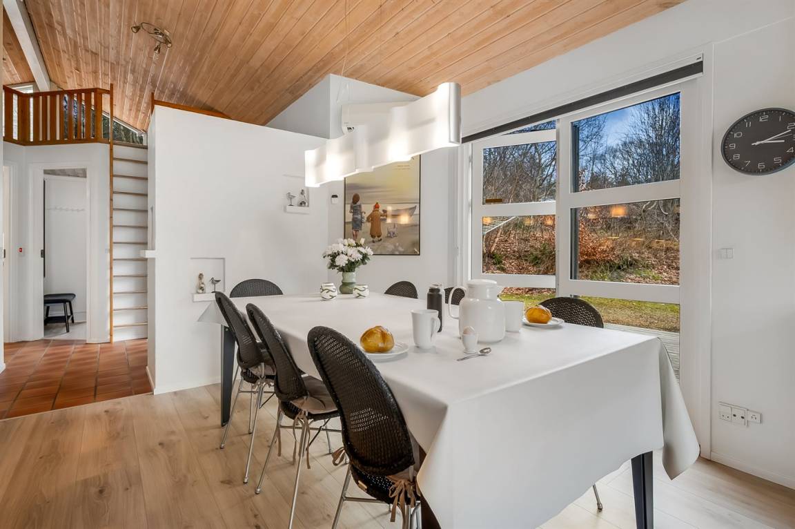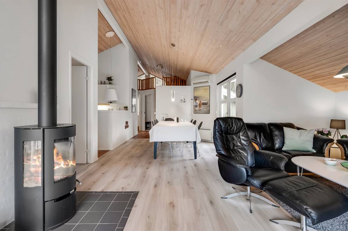 Im Inneren präsentiert sich das Ferienhaus hell und modern mit einer guten Raumaufteilung, die z. B. ideal für eine Familie mit Kindern geeignet ist. Zudem besteht die Möglichkeit, Großeltern oder weitere Gäste einzuladen. Der Mittelpunkt des Hauses ist die große, schöne Wohnküche, die mit dem Wohnzimmer kombiniert ist. Die großen Fensterpartien sorgen für einen fantastischen Lichteinfall. Vom Wohnzimmer aus hat man direkten Zugang zur herrlichen Terrasse.