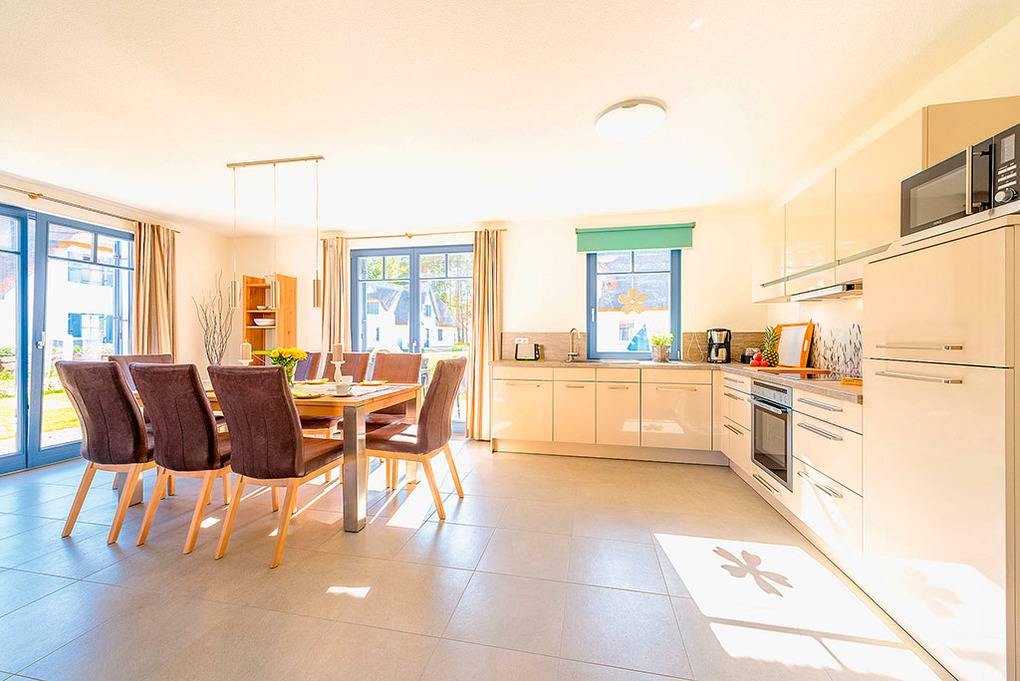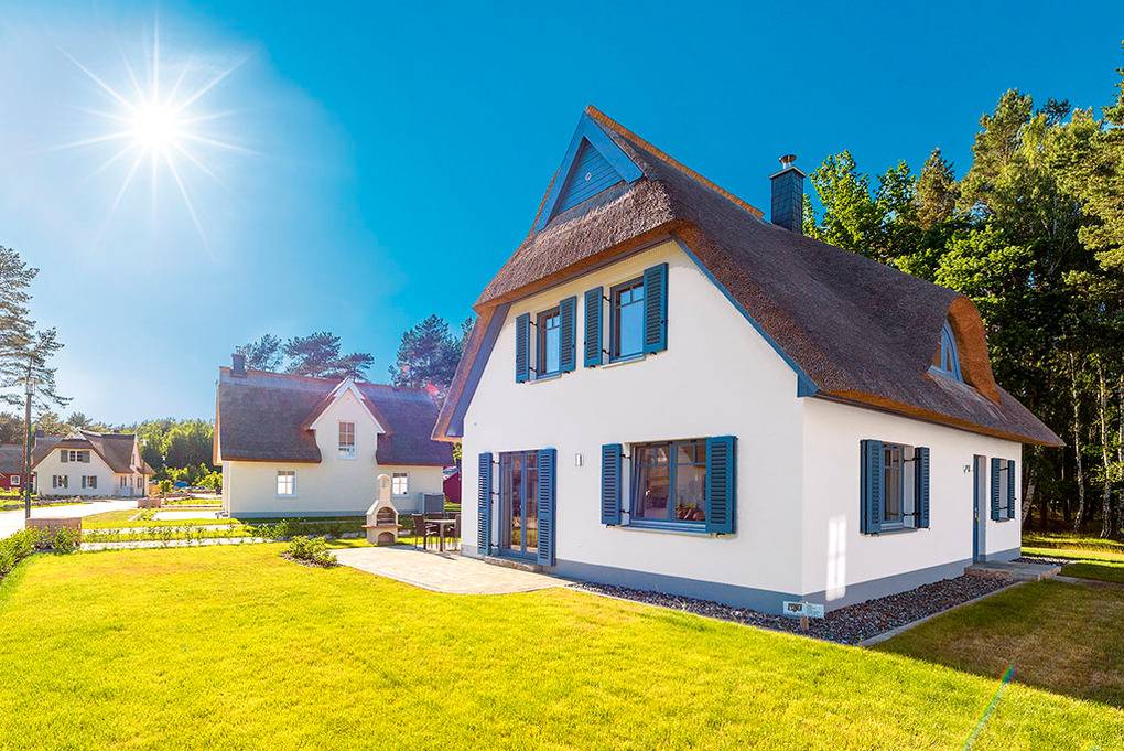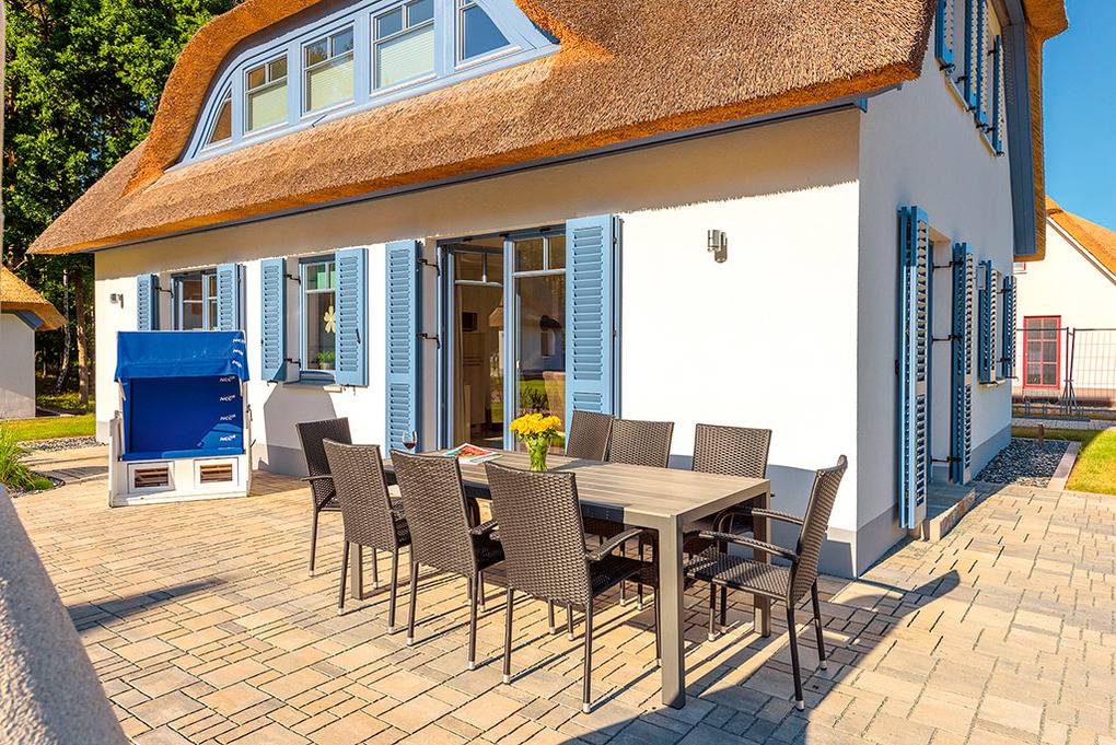 Haus: Exklusives Reetdachhaus mit Sauna und Kaminofen, 2015 neu erbaut. Nichtraucherhaus. Gehobene Ausstattung mit moderner, geschmackvoller Einrichtung. Alle Schlafzimmer mit Fliegenschutz. Treppenschutzgitter für Kinder. Kostenloser Internetzugang (W-Lan). Fußbodenheizung. Großes Grundstück (950 qm), Terrasse mit Sitzmöbeln, Strandkorb, Grill. Garten mit Rasenfläche, Gartenhaus. 2 Pkw-Stellplätze am Haus.