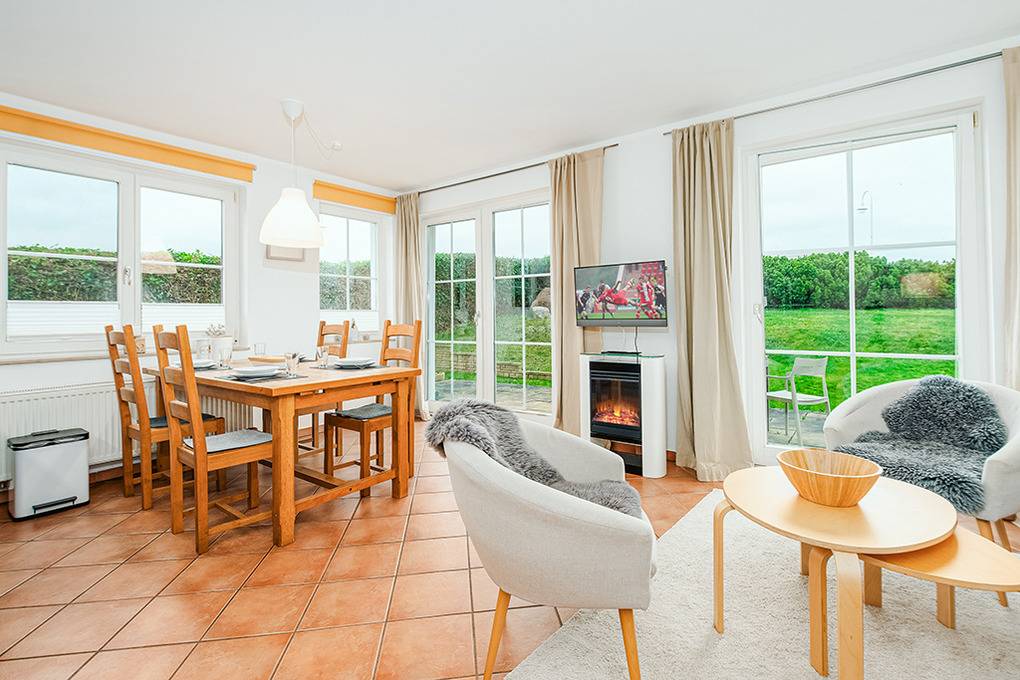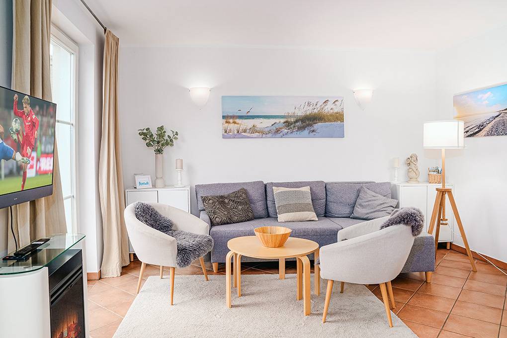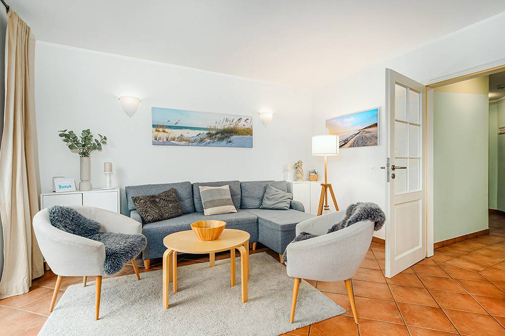 D 120.5 Wohnung 2-4 Pers.: 2-Zimmerwohnung mit 46 qm Wohnfläche, Parterre. Im skandinavischen Landhausstil geschmackvoll eingerichteter Wohn-/Essraum mit E-Kamin, Couchgarnitur (Ausziehcouch 2 Pers.), Sat-TV, Esstisch, moderner Küchenzeile (Backofen, Mikrowelle, Spülmaschine). Doppelzimmer. Bad: Du, Wb, WC, Waschmaschine. Terrasse mit Sitzmöbeln und Strandkorb.