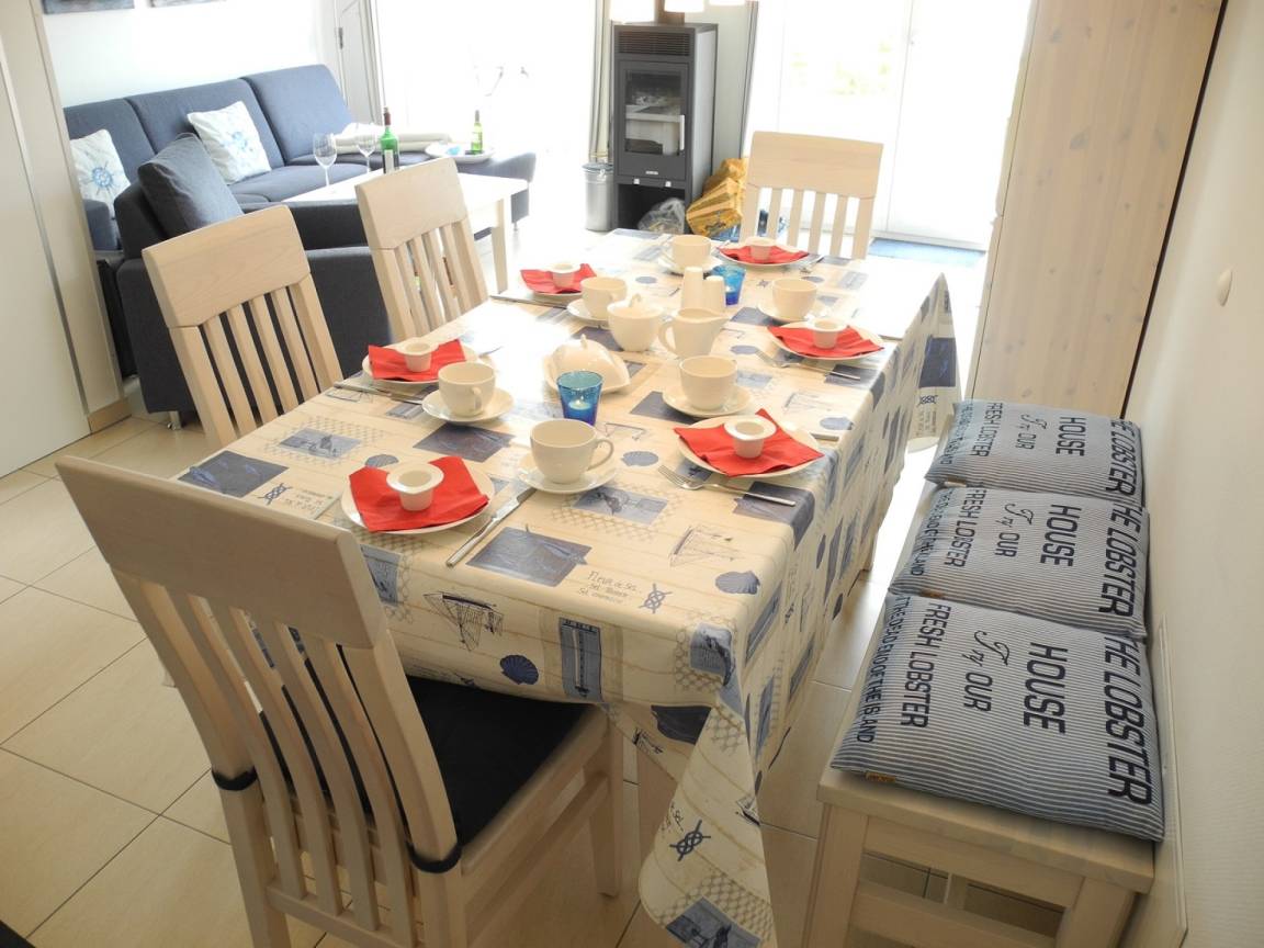 Im Erdgeschoß befindet sich der helle Wohnbereich mit Sitzecke inkl. Schlafsofa, ein Kaminofen, ein Smart-TV, ein großzügiger Essbereich und eine voll ausgestattete Küche.