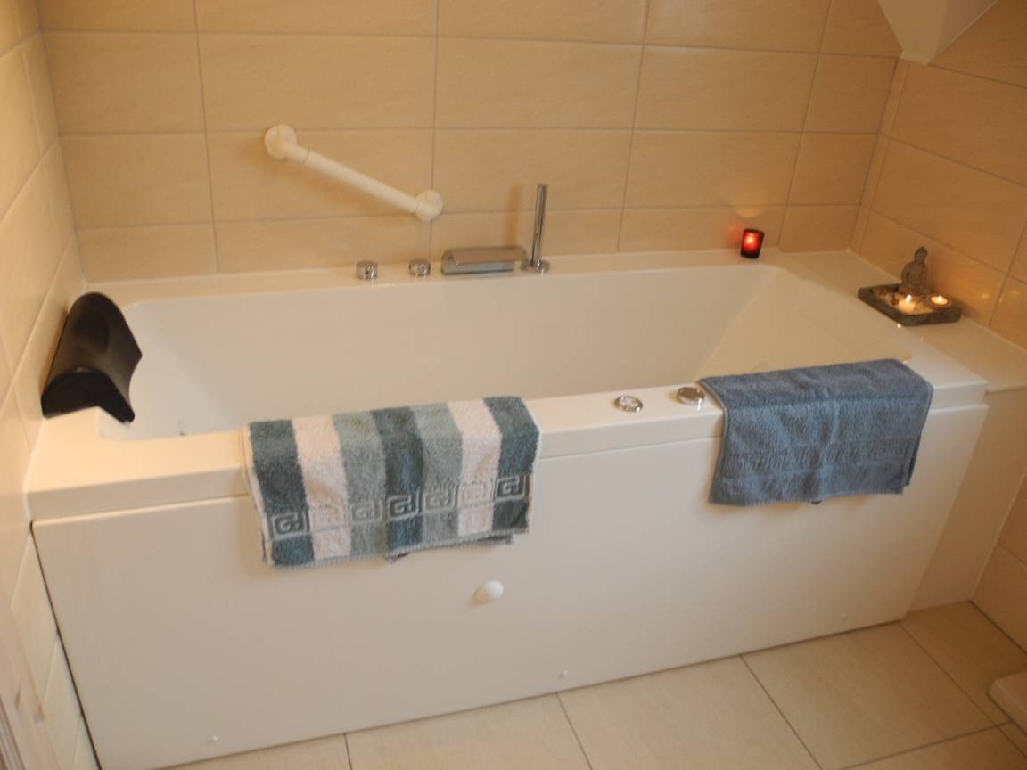 Im Obergeschoß sind zwei geräumige Schlafräume für 4 Personen und einem Baby oder Kleinkind. Das Bad ist ausgestattet mit einem Whirlpool.