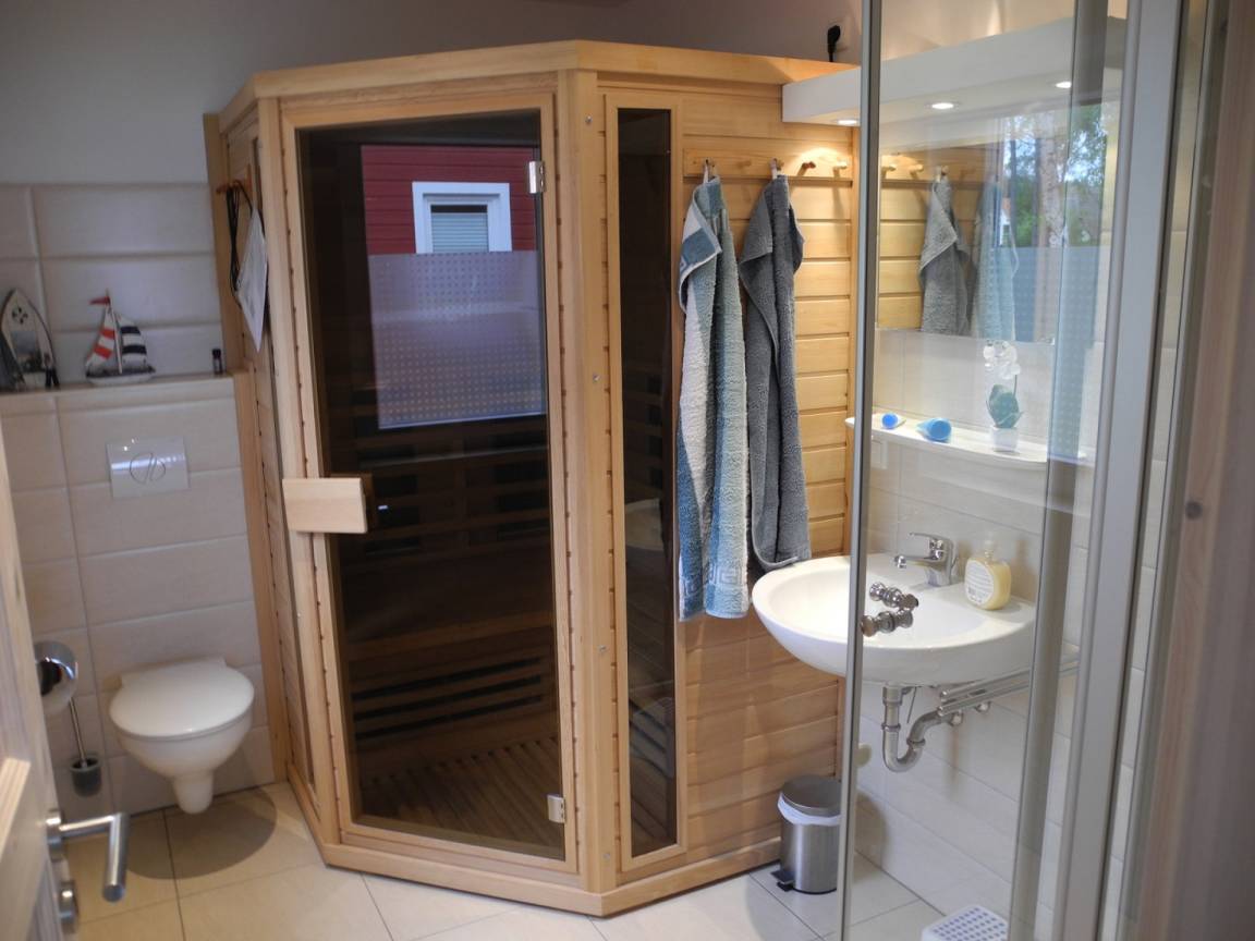 Ebenfalls im EG befindet sich ein Bad mit WC, Dusche und Infrarotsauna. Alle Räume im EG haben Fußbodenheizung.