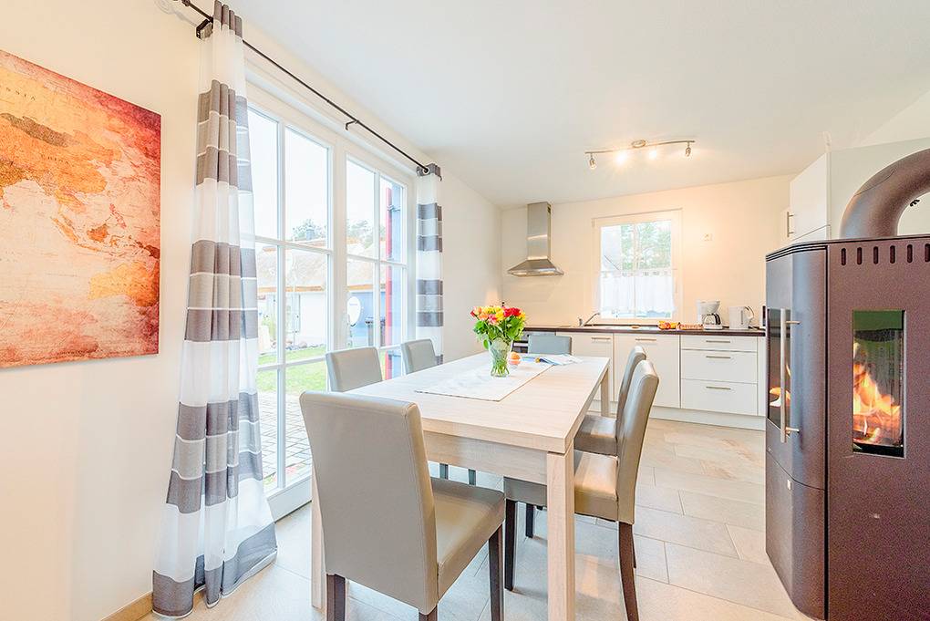 Haus: Komfortable Reetdachhaushälfte mit Sauna und Kaminofen, 2016 fertig gestellt. Nichtraucherhaus. Gehobene Ausstattung mit moderner, geschmackvoller Einrichtung. Waschmaschine, Fußbodenheizung. Kostenloser Internetzugang (W-Lan). Fliegenschutzgitter an allen Schlafzimmerfenstern. Bügelbrett und Bügeleisen vorhanden. Terrasse mit Sitzmöbeln, Grill. Gartenhaus mit Bollerwagen, Abstellmöglichkeit für Fahrräder. Schöner, umzäunter Garten mit Rasenfläche. 1 Pkw-Stellplatz am Haus.