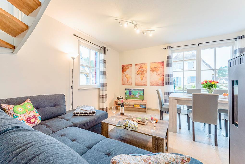 Ort: Glowe. Schöne, familiäre Ferienhaussiedlung am Dünenwald. Ostseestrand 300 m. Ortsmitte mit Geschäften, Restaurants 800 m. Seglerhafen mit Bootsverleih 1,9 km. Erlebniswelt "Splash" mit Schwimmbad, Sauna- und Wellnessbereich sowie Indoorspielplatz 7,9 km. Kap Arkona 19 km.