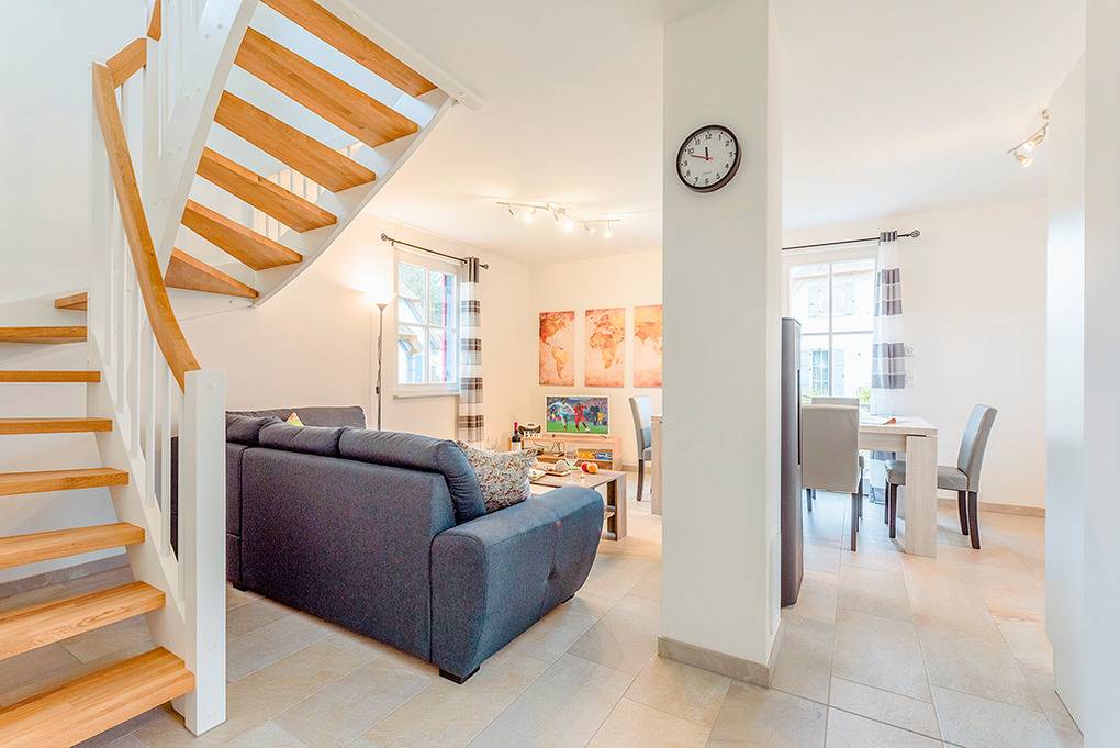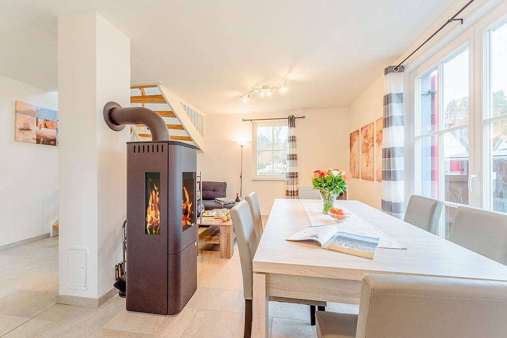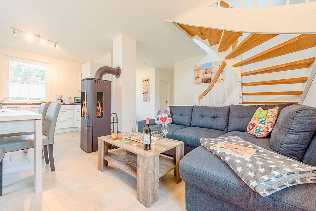D 120.41 Ferienhaus 2-6 Pers: Schöne 3-Zimmerhaushälfte mit 86 qm Wohnfläche über 2 Etagen. Parterre: Gemütlicher Wohn-/Essraum mit Kaminofen, Couchgarnitur, Sat-TV, DVD, Radio-CD, Esstisch, sehr gut ausgestatteter Einbauküche (Backofen, Mikrowelle, Spülmaschine). Saunaraum mit Dusche. Separates WC. Abstellraum mit Waschmaschine. 1. Etage: Zwei 3-Bettzimmer mit jeweils Doppelbett und hochwertiger Schlafcouch (1 Pers.). Bad: Du, Wb, WC.