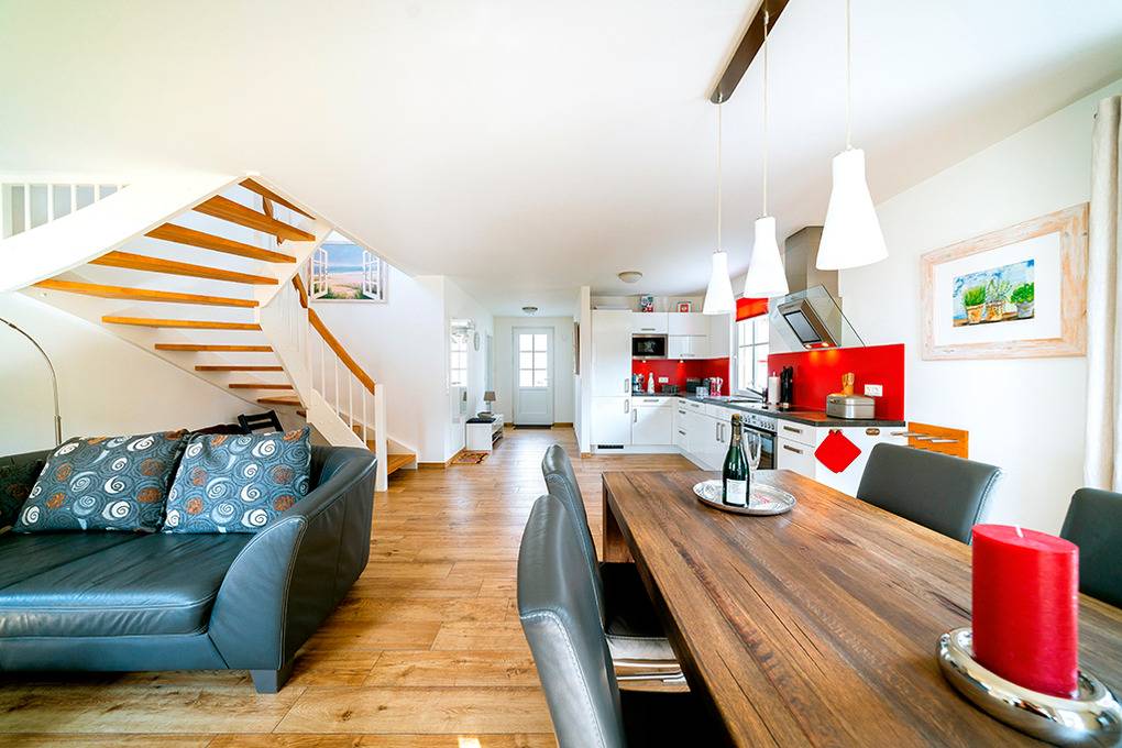 D 120.37 Ferienhaus 2-4 Pers.: Komfortables 3-Zimmerhaus mit ca. 95 qm Wohnfläche über 2 Etagen. Parterre: Stilvoll eingerichteter Wohn-/Essraum mit Kaminofen, Couchgarnitur, Schaukelstuhl, Sat-TV, Blu-Ray, Radio-CD, Esstisch, gut ausgestatteter Einbauküche (Backofen, Mikrowelle, Spülmaschine). Abstellraum mit Waschmaschine/Trockner. Bad: Sauna, Du, Wb, WC. 1. Etage: Zwei Doppelzimmer (1,80 m x 2,10 m) mit Sat-TV. Bad: Du, Bw, Wb, WC.