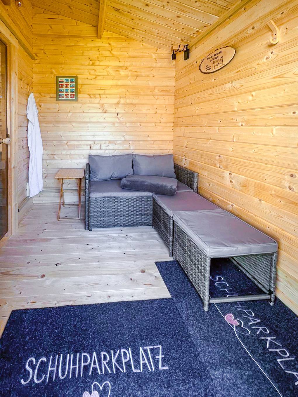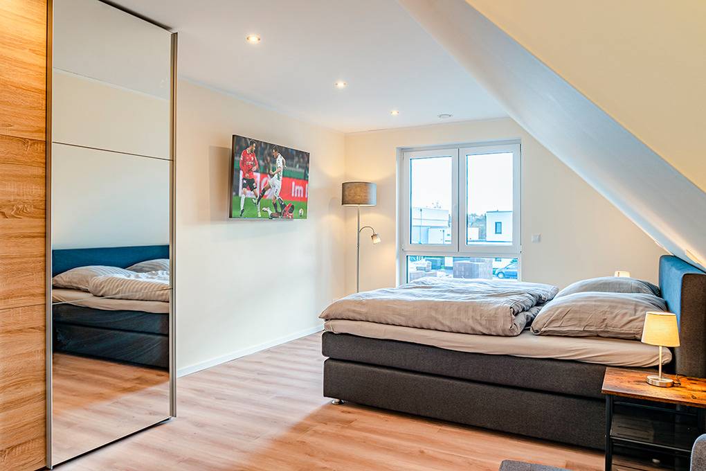 D 120.43 Ferienhaus 4-8 Pers.: Großzügige 5-Zimmerhaushälfte mit ca. 160 qm Wohnfläche. Parterre: Schöner Wohn-/Essraum mit Kaminofen, Couchgarnitur, Smart-TV, Internetzugang (Wireless-Lan), Esstisch, sehr gut ausgestatteter Küche mit Backofen, Mikrowelle, Spülmaschine. Doppelzimmer (Schlafcouch 2 Pers.), Schreibtisch. Bad/WC. Hauswirtschaftsraum mit Waschmaschine. 1. Etage: Zwei Doppelzimmer mit Smart-TV, davon eins mit Bad/WC. Weiteres Bad: Du, Bw, Wb, WC. 2. Etage mit Schrägen: 2-Bettzimmer (2 Schlafsessel, jeweils für 1 Person). Geräumige Sauna im Gartenhaus.