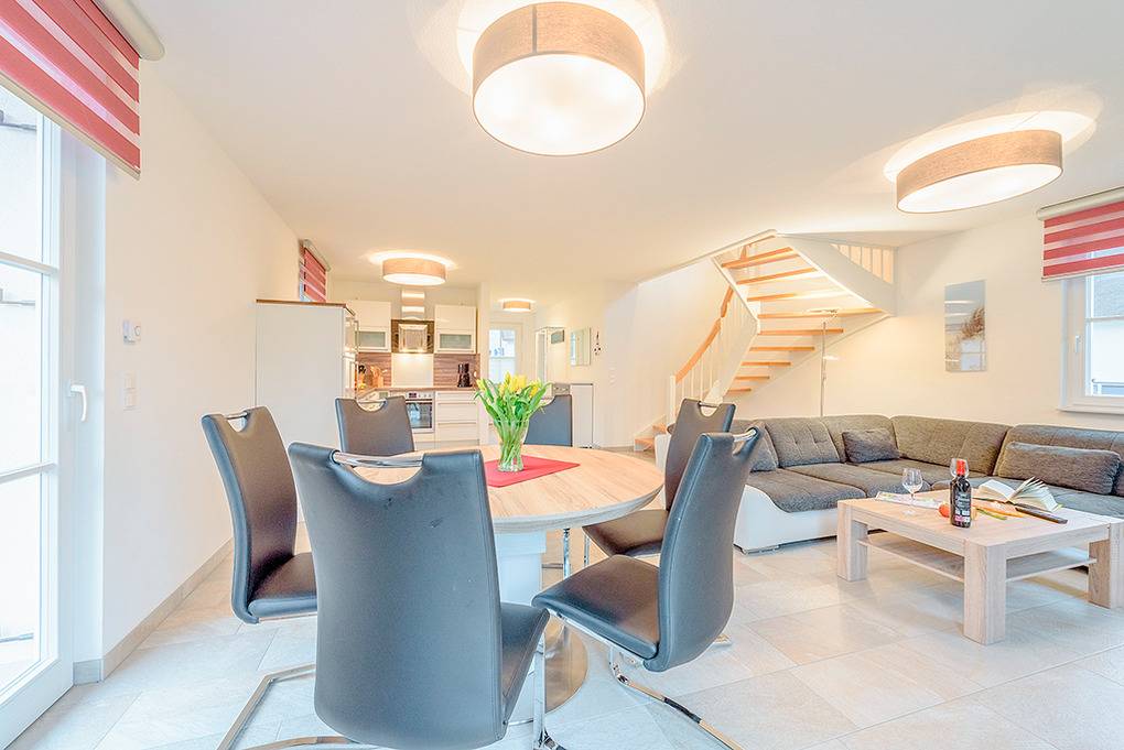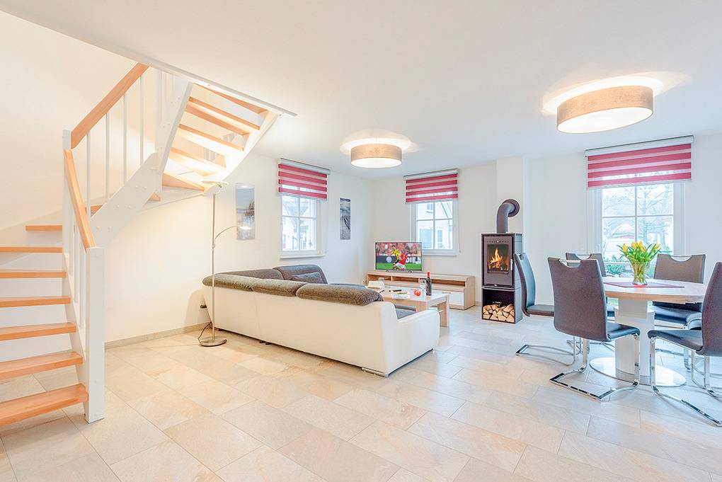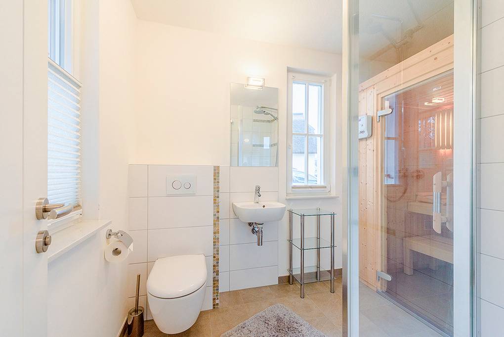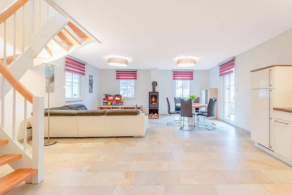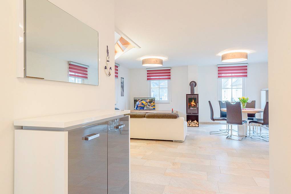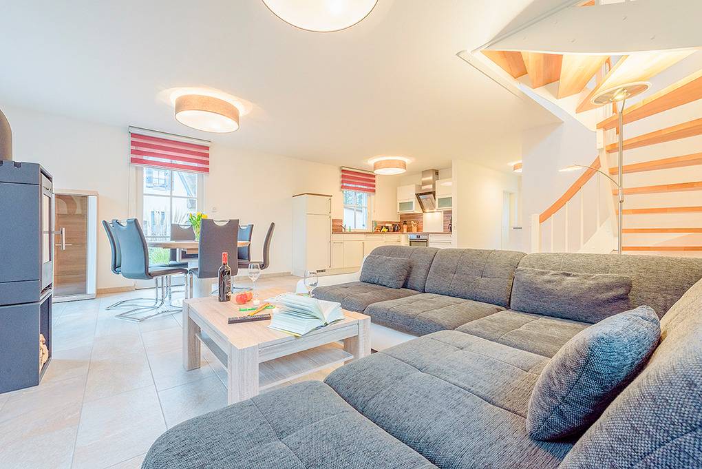 Nebenkosten: Endreinigung 180 € (wird bei Buchung erhoben). Kurtaxe. Bettwäsche, Handtücher leihbar 15 €/Pers (Bestellung). Saunapaket (Bademantel, Saunatuch) leihbar 8 €/Pers (Bestellung). Zusätzliche Leistungen: Saunanutzung und Internet-Nutzung im Preis inklusiv. 2 Pkw-Stellplätze im Preis inklusive. Babybett/Hochstuhl zusätzlich zur maximalen Personenzahl ohne Berechnung. Haustier 30 €/Aufenthalt, max. 2 Hunde (Anmeldung).Räume & Aufteilung