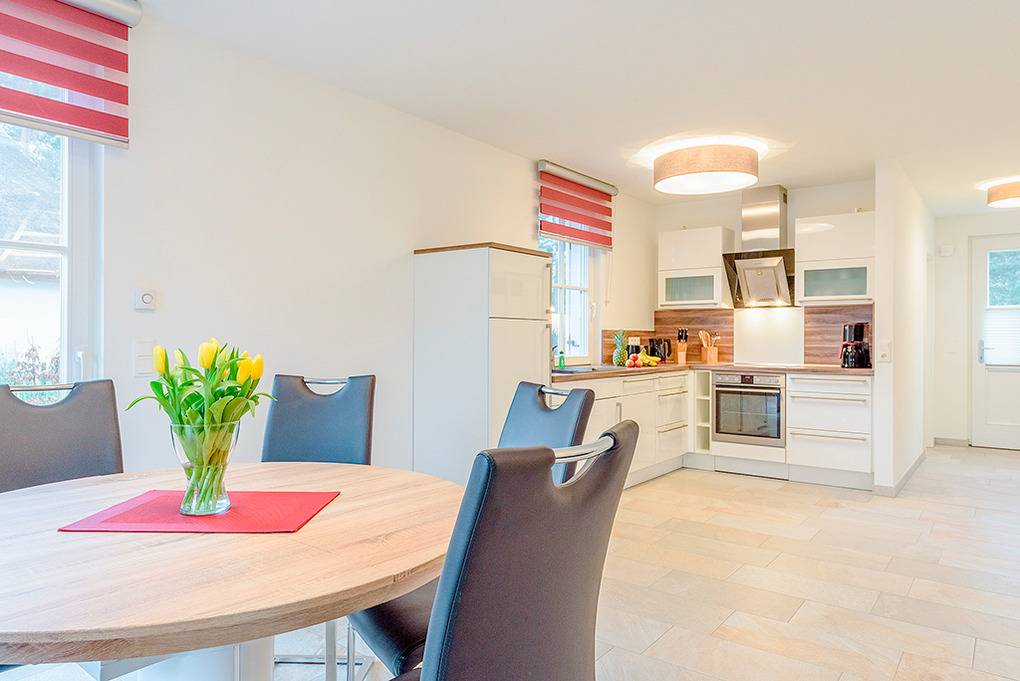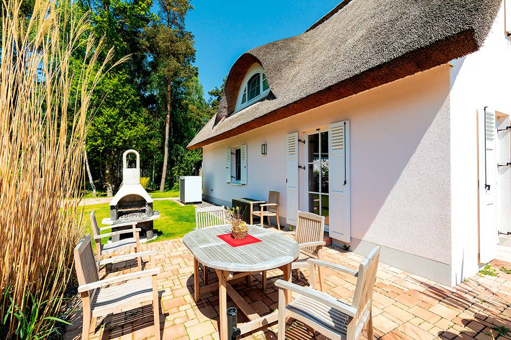 Haus: Komfortables Reetdachhaus mit Sauna und Kamin, 2016 neu erbaut. Nichtraucherhaus. Gehobene Ausstattung mit moderner, geschmackvoller Einrichtung. Kostenloser Internetzugang über W-Lan. Fußbodenheizung. Terrasse mit Sitzmöbeln, Aussengrillkamin. 2 Pkw-Stellplätze am Haus.