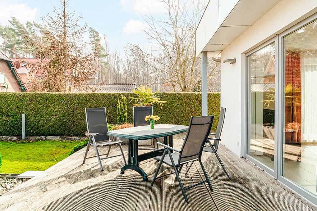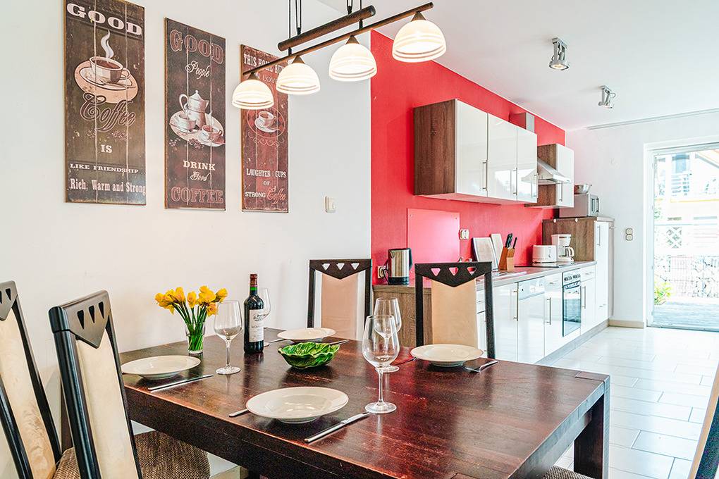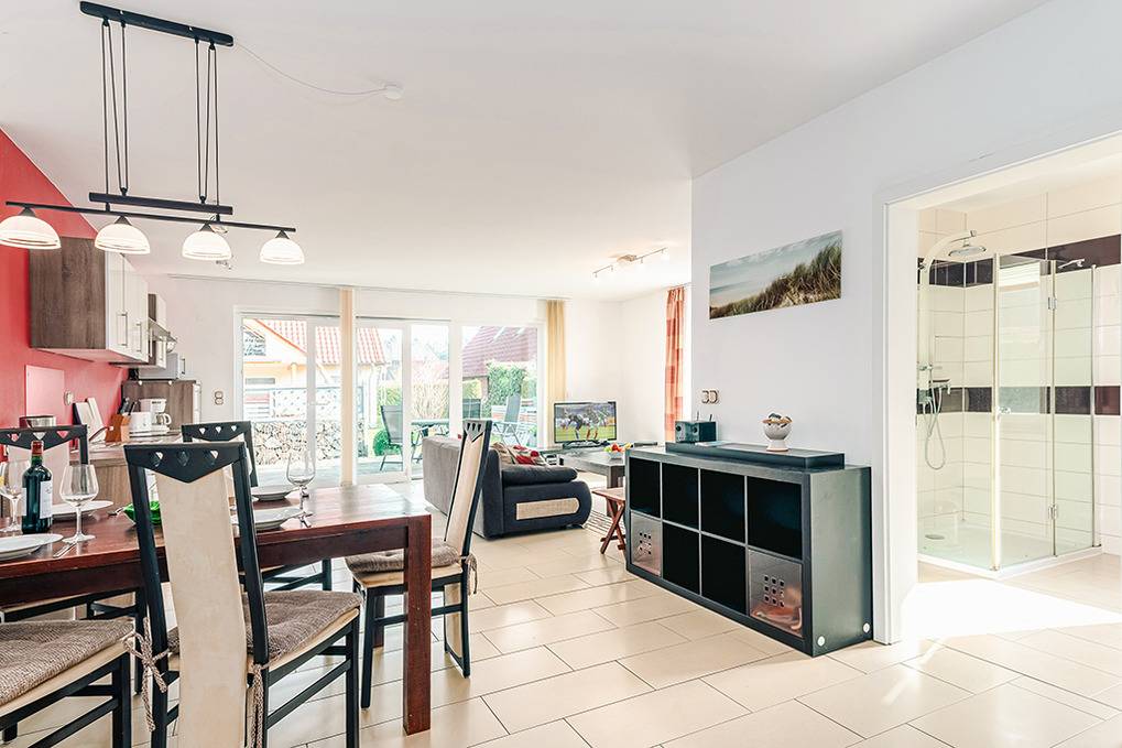 Haus: Modernes Ferienhaus mit zwei komfortablen Ferienwohnungen. Geschmackvolle Einrichtung. Fußbodenheizung. Kostenloser Internetanschluss (W-Lan). Terrasse mit Sitzmöbeln. 1 Pkw-Stellplatz/Fewo.