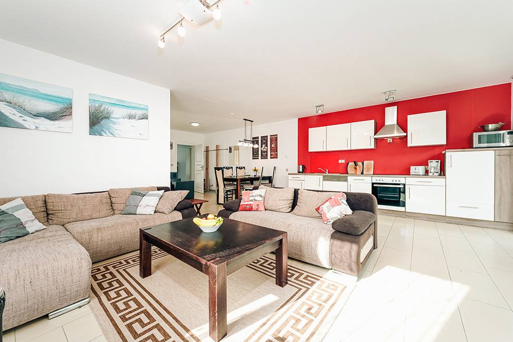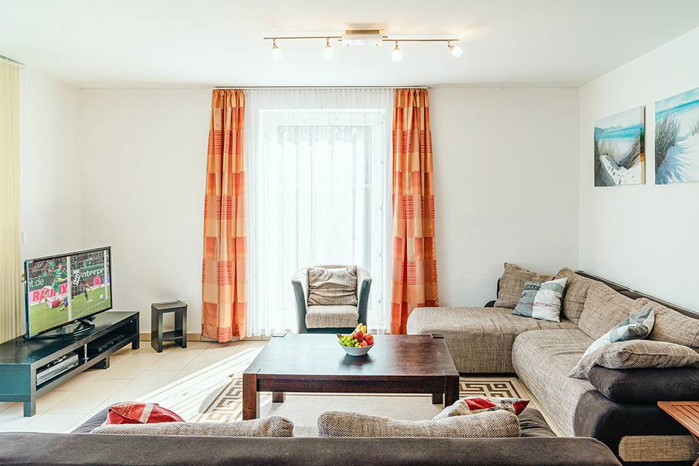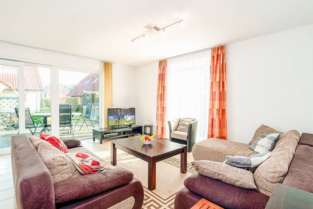 D 120.53 Wohnung 1-5 Pers.: Freundliche 3-Zimmerwohnung mit 78 qm Wohnfläche, Parterre. Großzügiger Wohn-/Essraum mit Couchgarnitur (Ausziehcouch 1 Pers.), Sat-TV, DVD, Esstisch, moderner Einbauküche (Backofen, Mikrowelle, Spülmaschine). Doppelzimmer mit Sat-TV. 2-Bettzimmer. Bad/WC. Terrasse mit Sitzmöbeln.