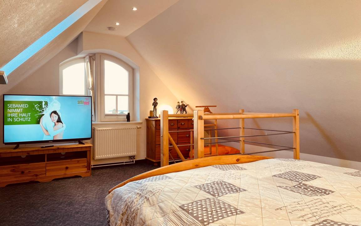 Hier haben Sie die einzigartige Möglichkeit, weitere 4 Gäste separat in einer eigenen, 55 qm großen Ferienwohnung unterzubringen. Die Wohnung ist über das gemeinsame Treppenhaus von innen aus den darüberliegenden Etagen komfortabel zu erreichen. Gr0ße Terrassenfenster bringen viel Licht in den kombinierten Wohn-/Essbereich mit direkt angrenzender großer Sonnenterrasse (32 qm, Westseite) und separatem Eingang. Das kombinierte Wohn- und Esszimmer besitzt eine voll ausgestattete Einbauküche mit 4er Ceranfeld; Mikrowelle, Kaffeemaschine, Toaster, Wasserkocher, Kühlschrank mit Gefrierteil sowie einen separaten Essplatz für 4 Gäste. Ebenso haben Sie SmartTV, DVD, CD-Radio und WLAN. In den zwei separaten Schlafzimmern stehen Ihnen jeweils zwei Doppelbetten und genügend Stauraum zur Verfügung. Außerdem haben Sie ein freundliches Bad mit Dusche/WC sowie eine Garderobe mit weiterem Stauraum. Die große, sonnige Außenterrasse ist mit Gartenmöbeln , Strandkorb und Grill versehen.