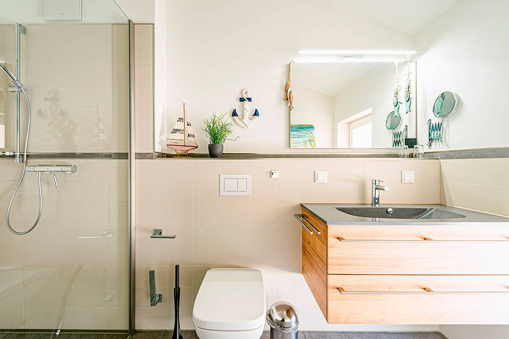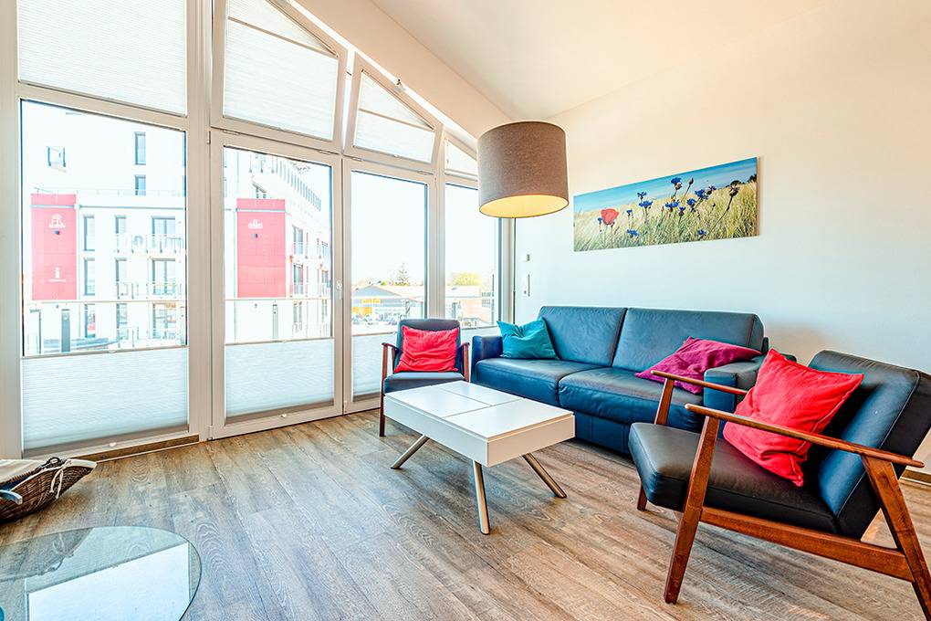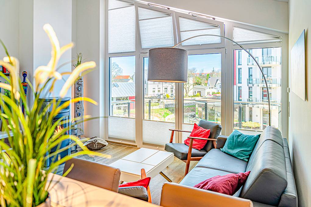 Haus: Ansprechendes Apartmenthaus mit hochwertigen Ferienwohnungen in der 1. Etage, 2019 neu erbaut. Komfortable Nichtraucher-Ferienwohnung mit Kaminofen. Kostenloser Internetzugang (W-Lan). Zentralheizung. 2 Balkone mit Sitzmöbeln. 1 Tiefgaragenstellplatz/ Fewo. Im Haus: Gemeinschaftssauna (kostenlose Nutzung) mit Ruheraum. Waschmaschine (Gebühr). Parterre mit Geschäften, Cafés.