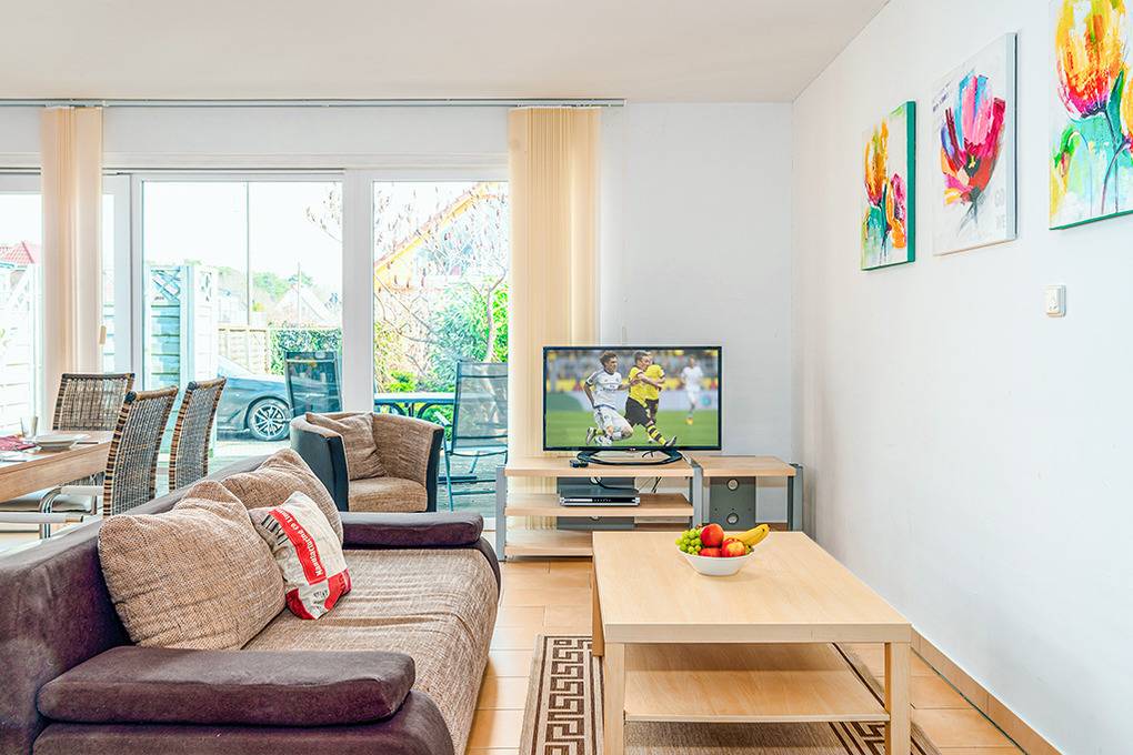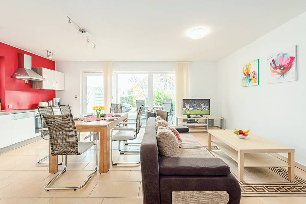 D 120.52 Wohnung 1-5 Pers.: Freundliche 3-Zimmerwohnung mit 66 qm Wohnfläche, Parterre. Großzügiger Wohn-/Essraum mit Couchgarnitur (Ausziehcouch 1 Pers.), Sat-TV, DVD, Esstisch, moderner Einbauküche (Backofen, Mikrowelle, Spülmaschine). Doppelzimmer mit Sat-TV. 2-Bettzimmer. Bad/WC. Terrasse mit Sitzmöbeln.