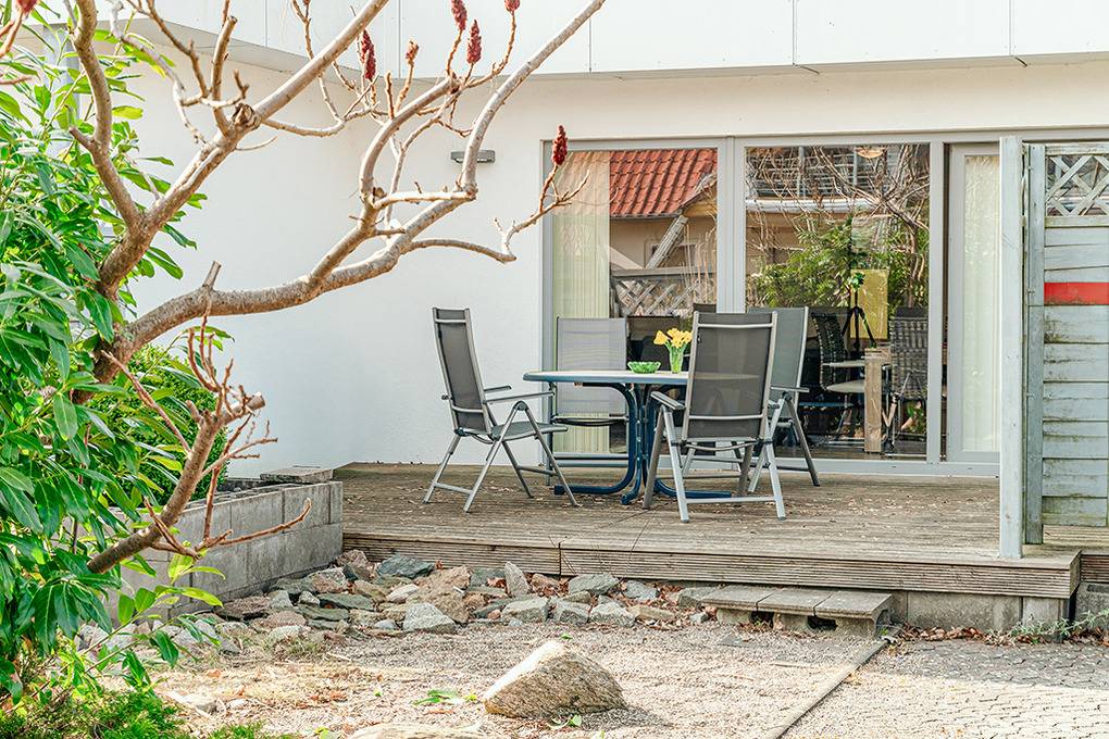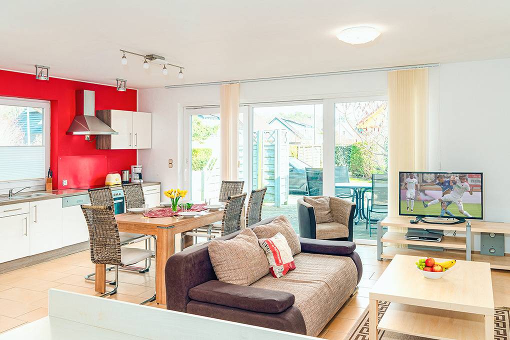 Haus: Modernes Ferienhaus mit zwei komfortablen Ferienwohnungen. Geschmackvolle Einrichtung. Fußbodenheizung. Kostenloser Internetanschluss (W-Lan). Terrasse mit Sitzmöbeln. 1 Pkw-Stellplatz/Fewo.