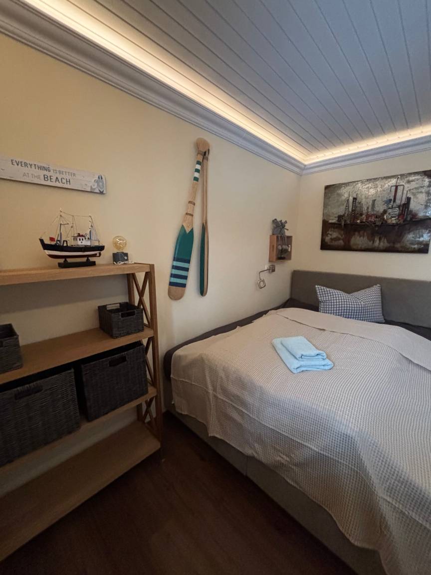 Für erholsame Nächte sorgen zwei gemütliche Schlafzimmer. Das größere Schlafzimmer ist mit einem komfortablen Doppelbett (180x200) sowie einem Kleiderschrank ausgestattet, während das zweite Schlafzimmer ein Boxspring-Doppelbett (160x200) bietet. Jedes Zimmer verfügt über hochwertige Matratzen, eigene Fernseher (1x Smart-TV) sowie jeweils einen eigenen Arbeitsbereich mit Schreibtisch und Stuhl (Homeoffice).