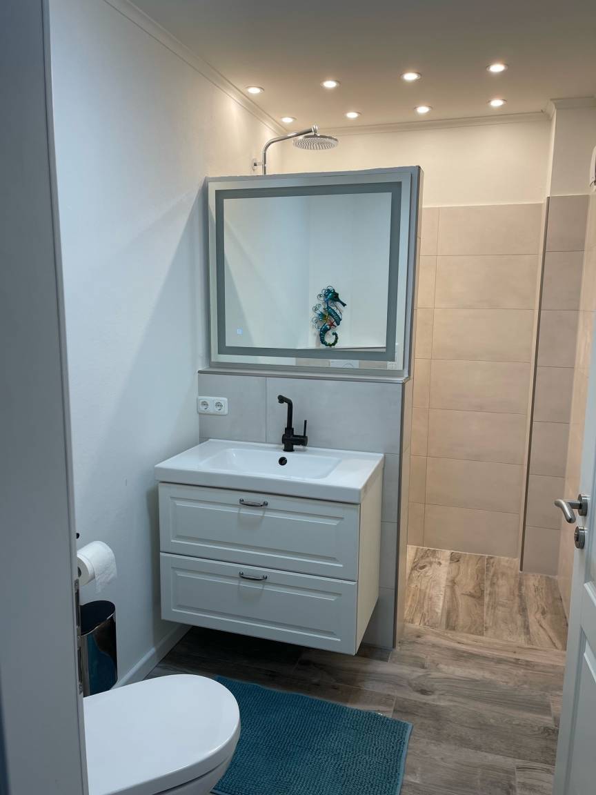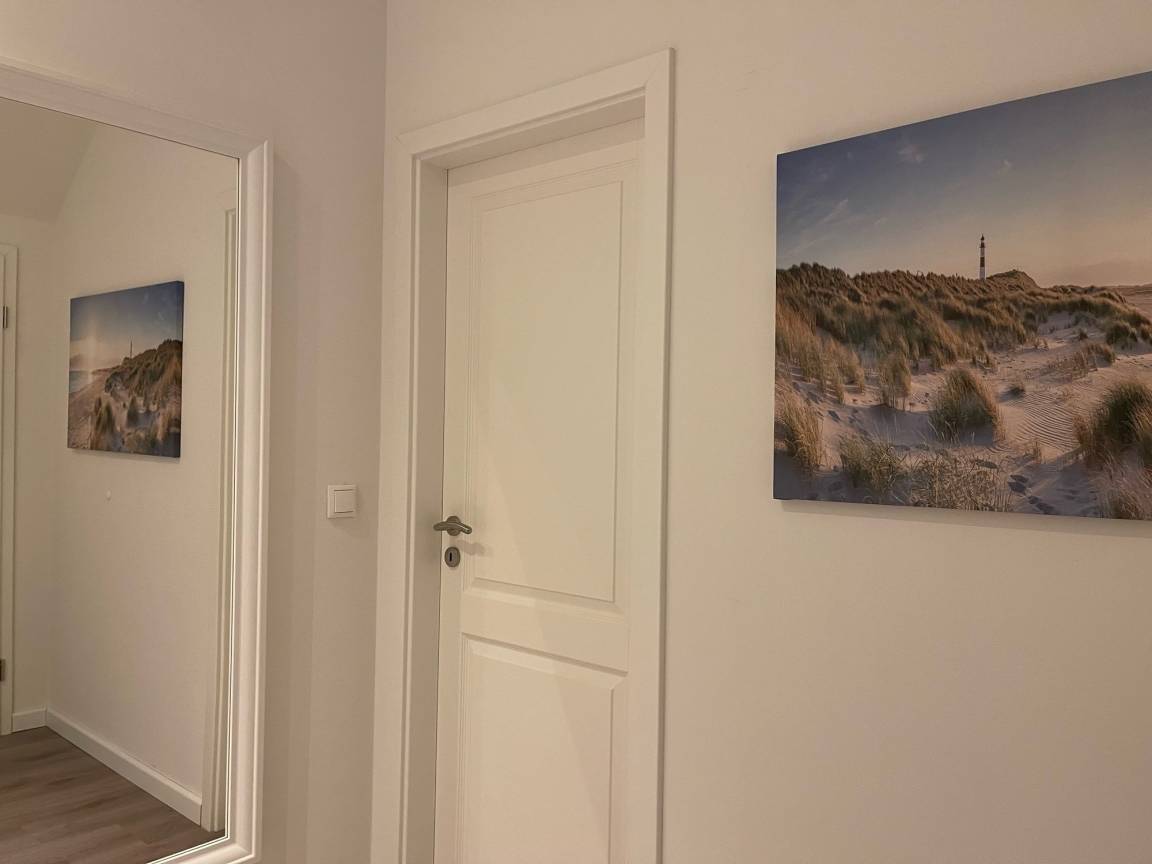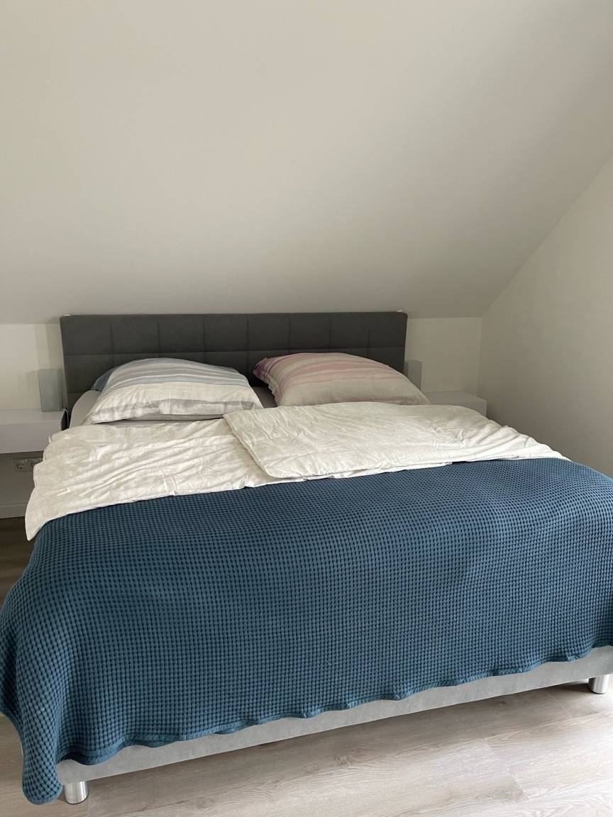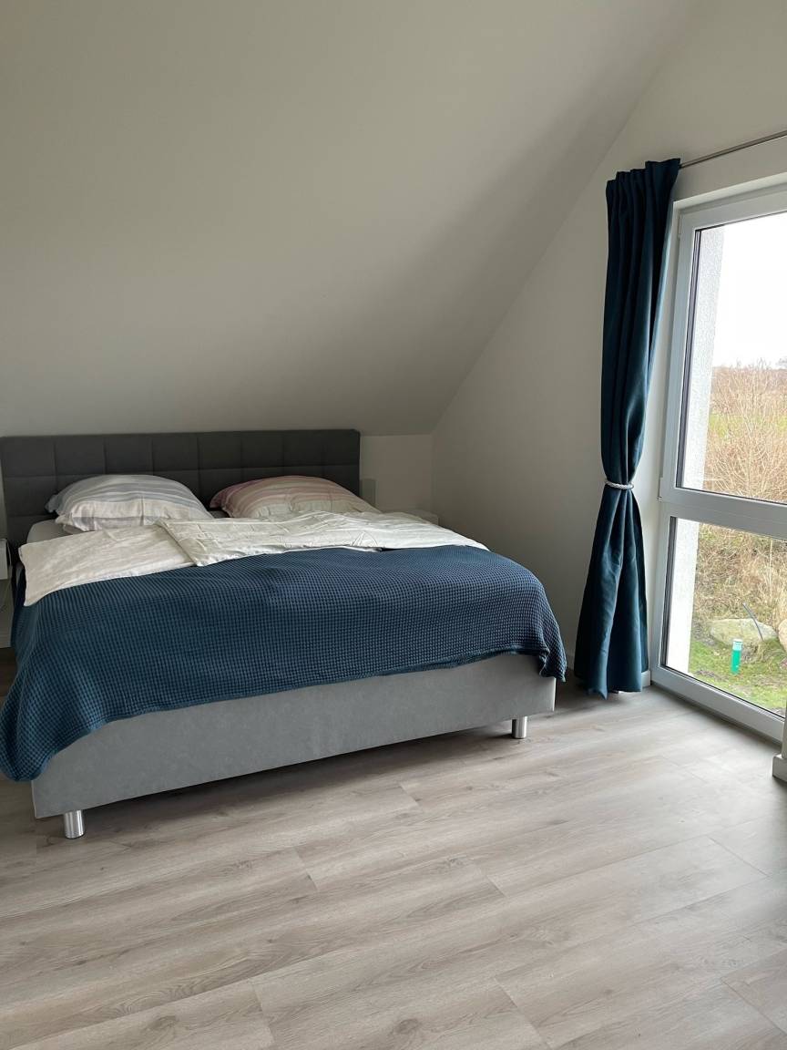 Im Obergeschoss befinden sich zwei zusätzliche Schlafzimmer, die ebenfalls eine ruhige und entspannte Atmosphäre bieten. Das große Badezimmer im Obergeschoss ist mit einer Duschwanne und einer Regendusche ausgestattet, sodass Sie nach einem Tag am Strand oder einer Fahrradtour durch das Naturschutzgebiet von Holnis herrlich entspannen können. Alle Schlafräume sind mit schweren Vorhängen versehen, die für eine erholsame Nachtruhe sorgen und Ihnen auch tagsüber Privatsphäre bieten.