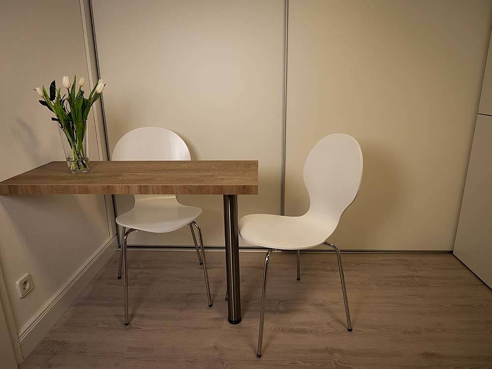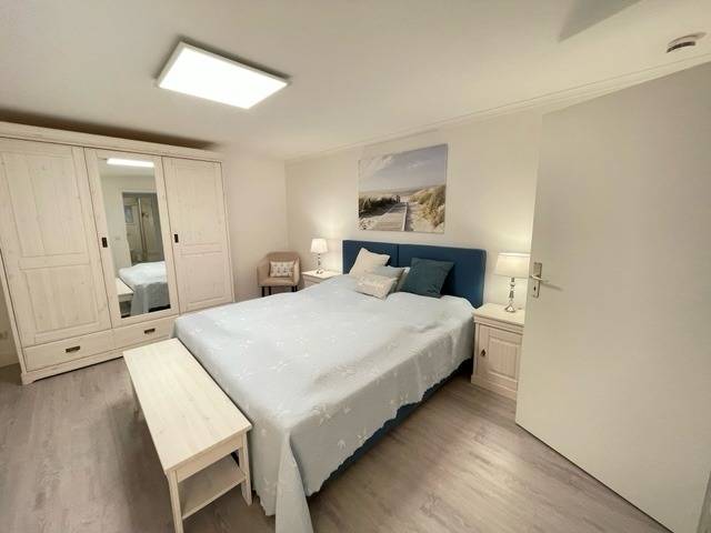 Die Ferienwohnung verfügt über zwei geschmackvoll eingerichtete Schlafzimmer. Beide sind mit komfortablen Doppelbetten (180x200 cm) ausgestattet und bieten höchsten Schlafkomfort. Ein Schlafzimmer ist zusätzlich mit einem Fernseher ausgestattet, sodass Sie sich gemütlich im Bett entspannen und Ihre Lieblingssendungen genießen können. Alle Zimmer sind mit modernen Plissees versehen, die nicht nur vor unerwünschtem Licht schützen, sondern auch einen eleganten Look verleihen. Das zweite Schlafzimmer ist innenliegend und hat kein Fenster.