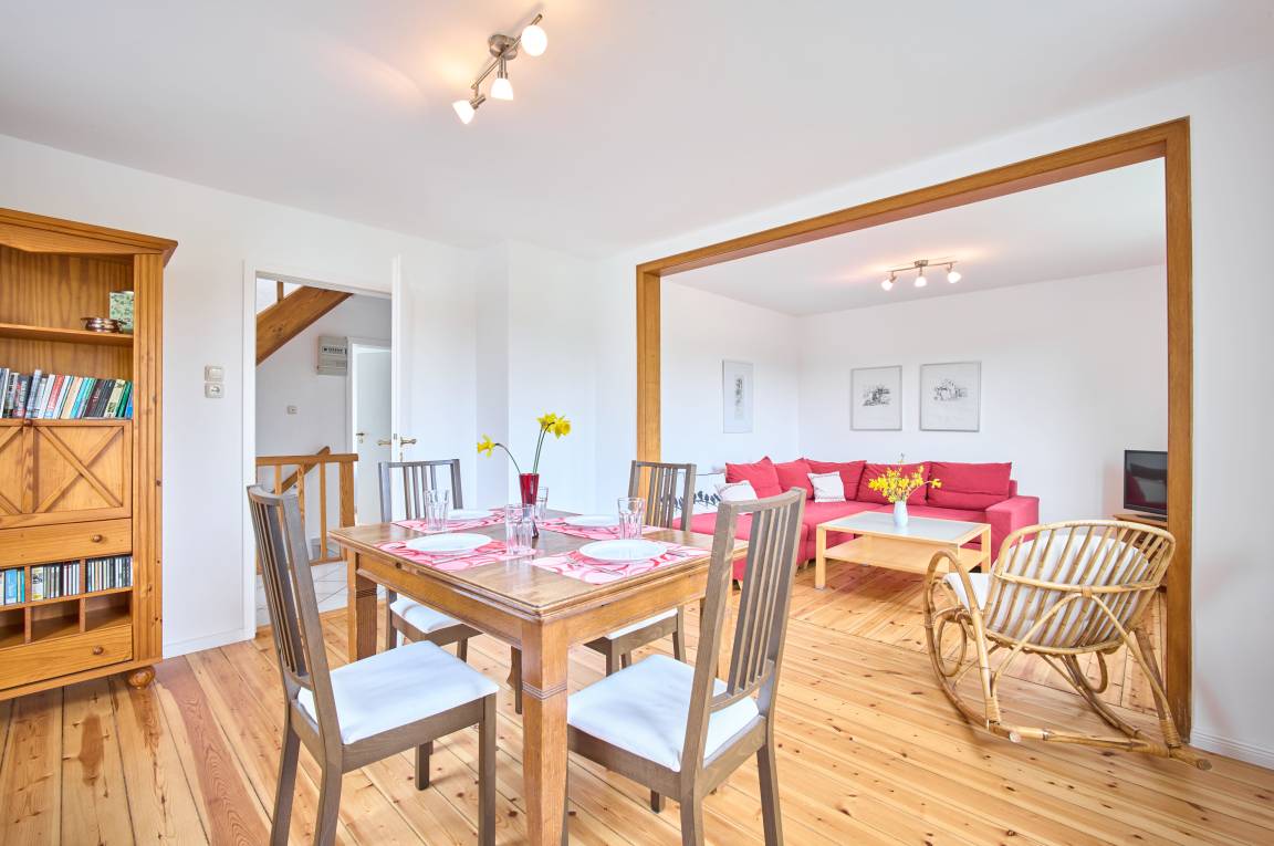Im Erdgeschoss erwartet Sie ein großzügiger Wohnbereich, der mit einer bequemen Sitzecke und einem Esstisch ausgestattet ist. Hier können Sie nach einem erlebnisreichen Tag gemütlich zusammensitzen, sich austauschen und die angenehme Atmosphäre genießen. Der Wohnbereich ist mit einem Sat-Fernseher und einem DVD-Player ausgestattet – perfekt für gemütliche Filmabende, bei denen Sie sich nach einem Tag voller Aktivitäten entspannen können. Das Wohnzimmer verfügt zudem über ein Schlafsofa, das zusätzlichen Platz für Gäste bietet und für spontane Übernachtungen sorgt.