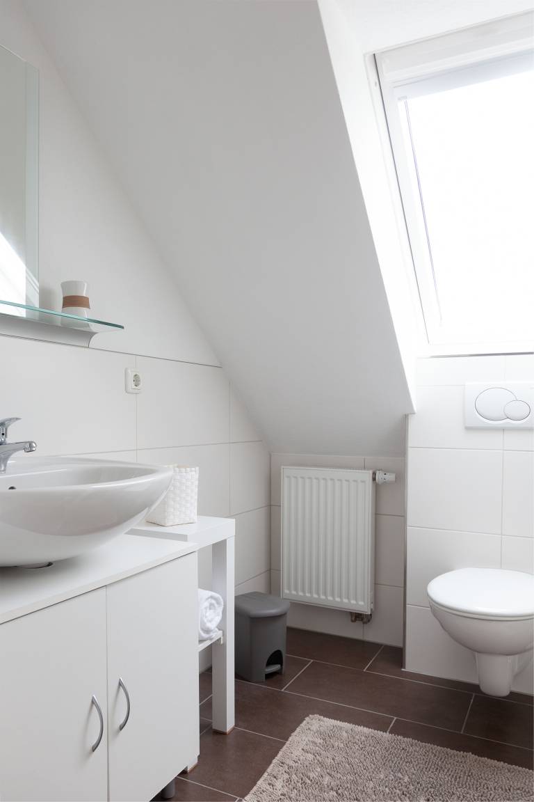 Im Obergeschoss befinden sich zwei weitere Schlafzimmer sowie ein zweites Tageslichtbad mit Dusche, Waschbecken und WC. Die Schlafzimmer sind mit komfortablen Betten ausgestattet, darunter zwei Doppelbetten, ein Schlafzimmer mit zwei Einzelbetten und ein weiteres mit einem Etagenbett.
