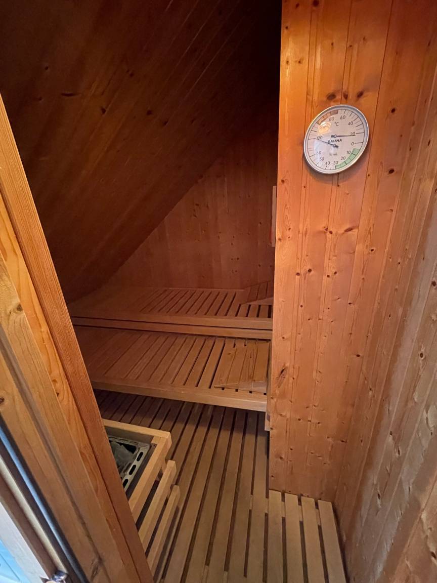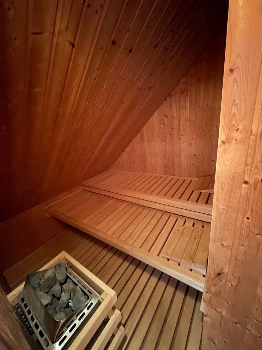 Ein echtes Highlight ist die hauseigene Sauna, die bis zu vier Personen Platz bietet und nach einem Tag voller Aktivitäten zum Entspannen einlädt. Lassen Sie die wohlige Wärme auf sich wirken und genießen Sie diesen kleinen Luxus, der Ihren Aufenthalt zu einem ganz besonderen Erlebnis macht. Zwei moderne Tageslichtbäder, jeweils mit Dusche, Waschbecken und WC, bieten zusätzlichen Komfort für die ganze Familie.