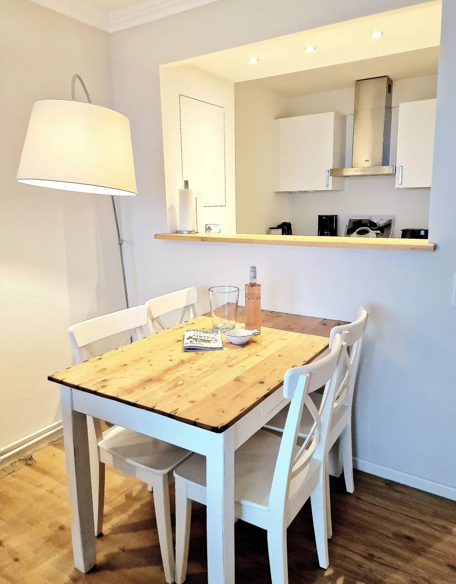 Das Schlafzimmer präsentiert sich in einem maritimen Stil, gehalten in Weiß und Türkis. Sowohl das Bett als auch die Matratzen sind brandneu. Die nagelneue Einbauküche ist komplett ausgestattet mit einem Geschirrspüler, einem Kühlschrank und einem Backofen mit Cerankochfeld. Von Ihrem Küchentresen aus können Sie den Blick ins Wohnzimmer genießen und weiter auf die Förde schweifen lassen.
