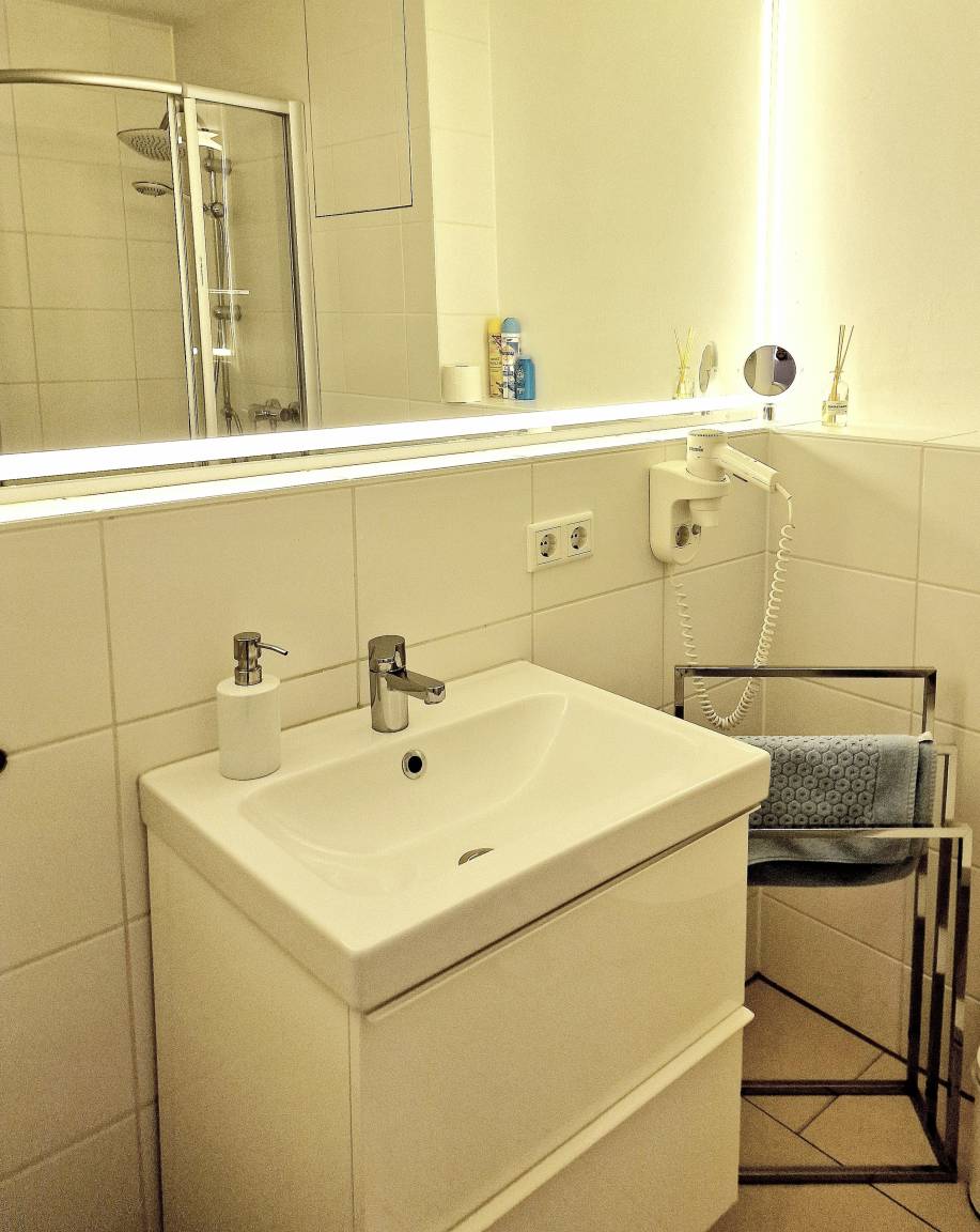 Im Duschbad steht Ihnen außerdem eine Waschmaschine sowie ein Trockner zur Verfügung. Großzügige Schränke im Schlafzimmer und im Flur bieten ausreichend Platz für Ihre Urlaubsgarderobe. Optional können Bettwäsche und Handtücher für € 25 pro Person dazu gebucht werden – Strandtücher bitten wir Sie, selbst mitzubringen.