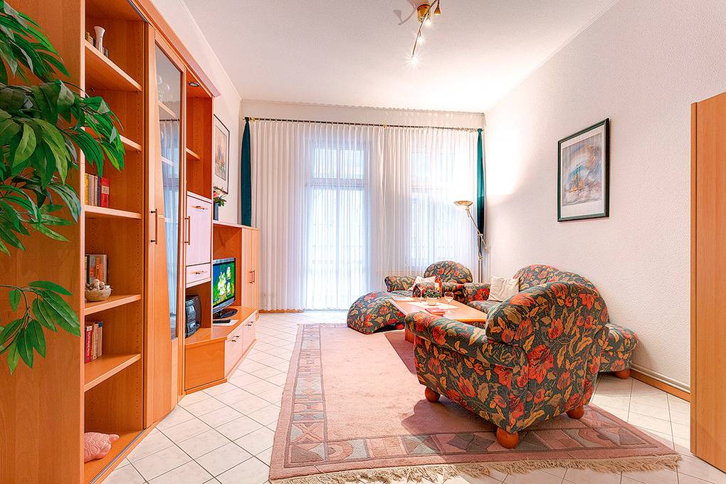 Haus: Im Stile der Bäderarchitektur restauriertes Appartementhaus mit kleinem Saunabereich. Kostenloser Internetzugang über W-Lan (nur D 93.23). Waschmaschine, Wäschetrockner in der Anlage. Zentralheizung. 1 PKW-Stellplatz pro Fewo.