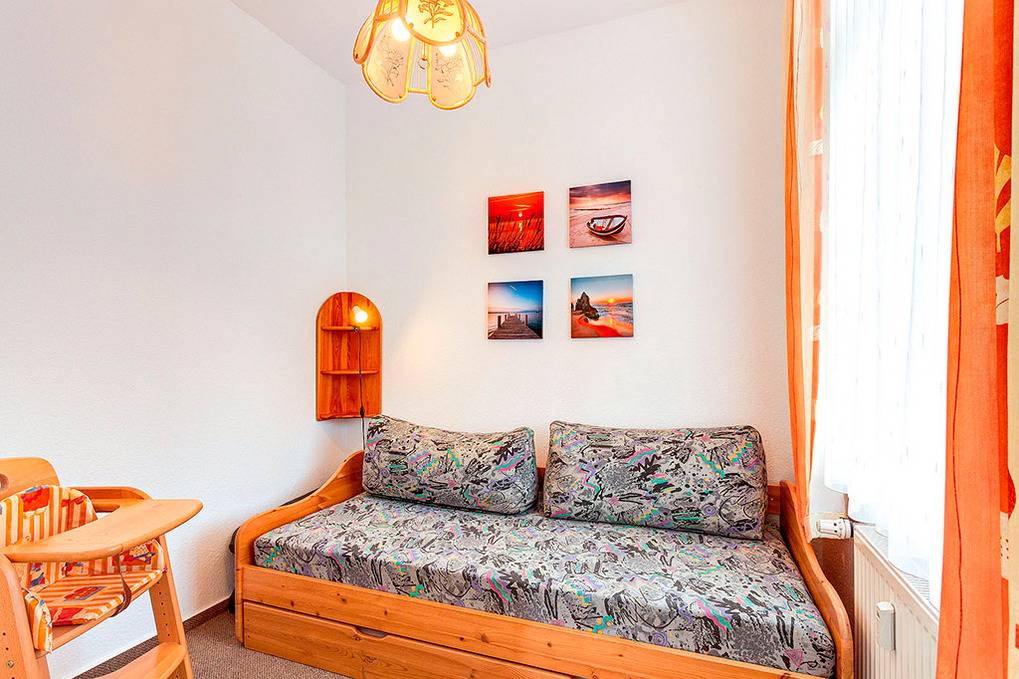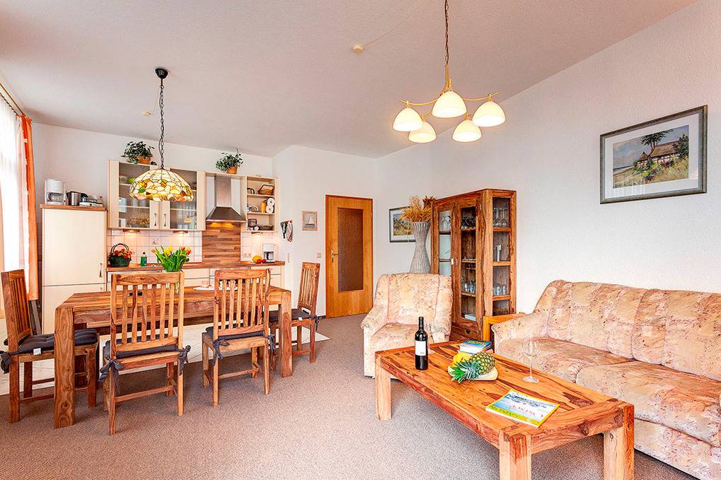D 93.6 Wohnung 2-6 Pers.: 3-Zimmerwohnung, 68 qm Wohnfläche, 1. Etage. Geräumiger Wohn-/Essraum mit Couchgarnitur (Ausziehcouch 2 Pers.), Esstisch, Sat-TV, moderner Küchenzeile (Backofen, Spülmaschine). Doppelzimmer. Kleines 2-Bettzimmer mit Ausziehbett. Bad/WC.