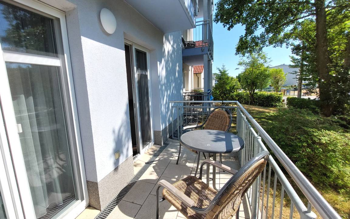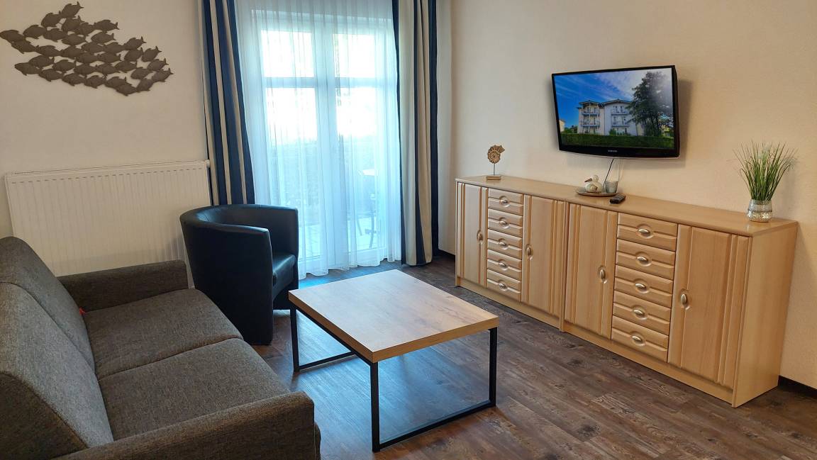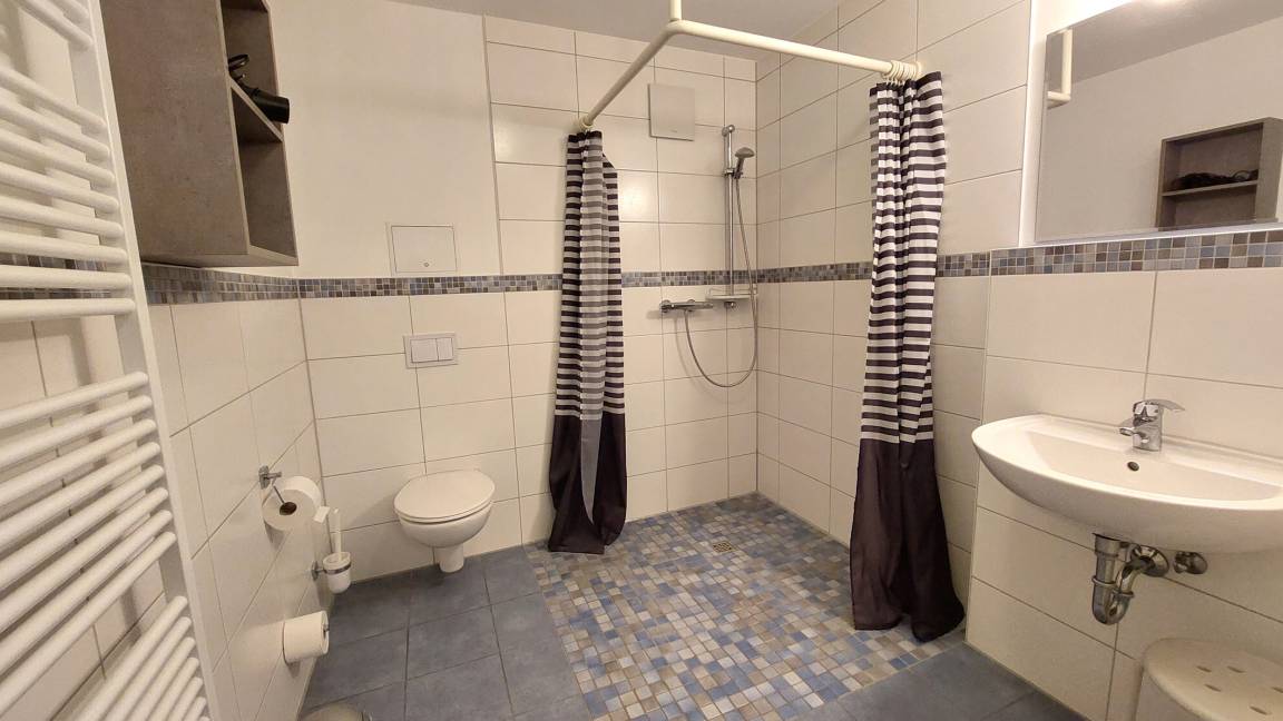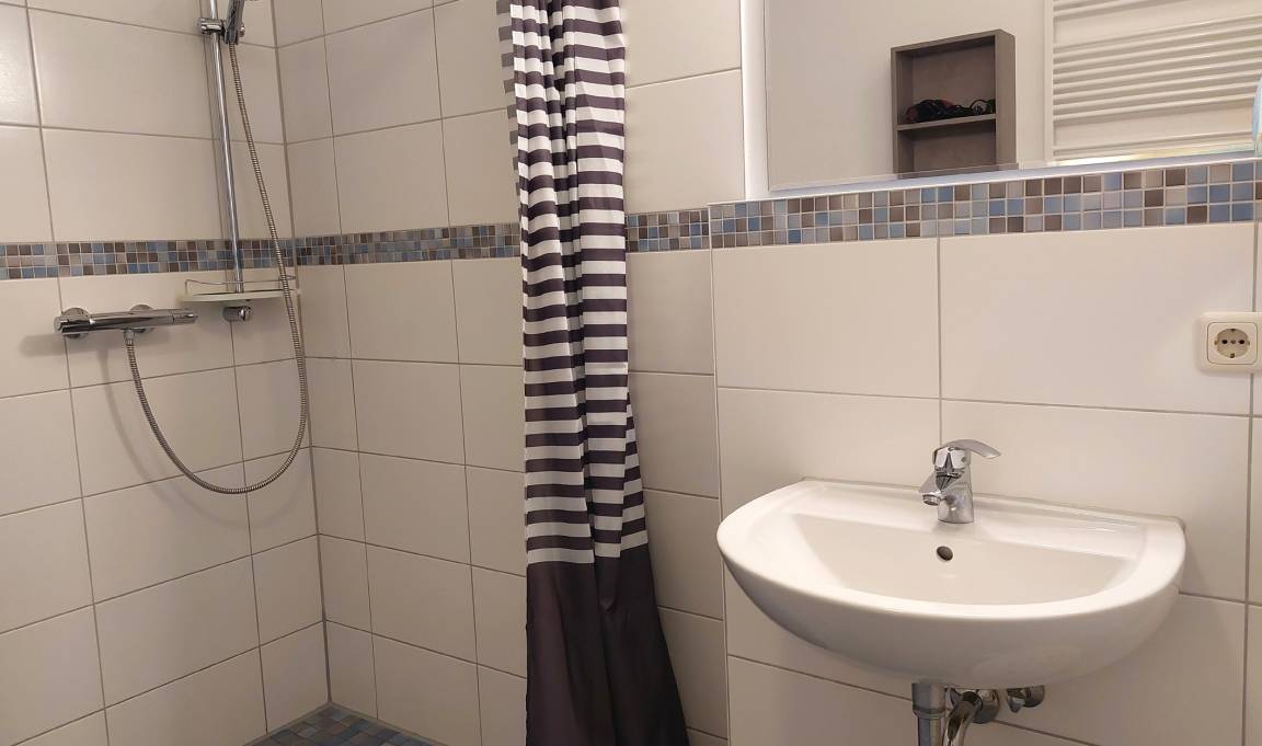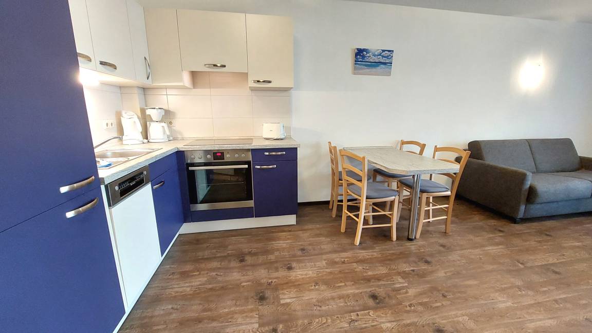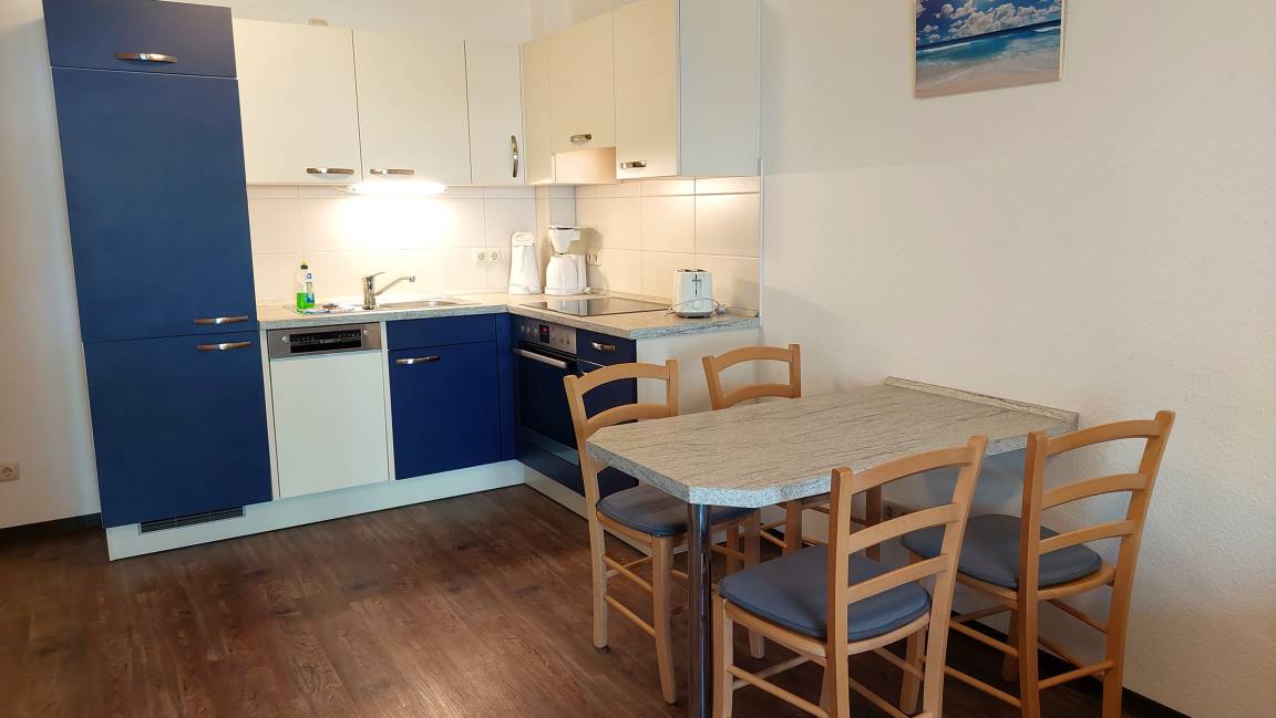 Diese freundliche Wohnung ist aufgeteilt in einen Wohnraum mit Terrasse und integrierter Küchenzeile, ein Schlafzimmer ebenso mit Zugang zur Terrasse und ein Duschbad mit Waschtisch und WC. In dieser Wohnung gibt es besonders große ebenerdige Dusche. Das Wohnzimmer begrüßt Sie mit einem Schlafsofa und Sessel sowie Flachbild-TV. Das geräumige Schlafzimmer verfügt über ein Doppelbett (1,80m x 2m) sowie einen Kleiderschrank. Die Küchenzeile ist mit Backofen, Geschirrspüler, Cerankochfeld, Kühlschrank mit kleinem Gefrierfach, Cerankochfeld, Mikrowelle, Kaffeemaschine, Wasserkocher und Toaster ausgestattet. Highlights: Kostenfreies WLAN sowie ein frei wählbarer PKW-Stellplatz direkt am Haus. Haustiere sind in dieser Wohnung herzlich willkommen.