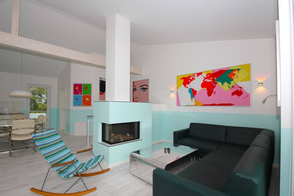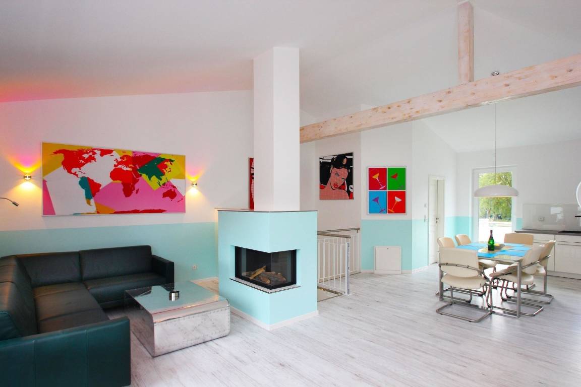 Das Beach House Rügen bietet mit zwei identischen Haushälften luxuriöse Ferienunterkünfte, jede mit 140 Quadratmetern. Im Erdgeschoss befinden sich drei Schlafzimmer mit Boxspringbetten, jeweils ausgestattet mit einem 32 Zoll Flachbild-TV und hochwertigen HÜLSTA Möbeln. Zudem ist eine Sauna sowie ein Badezimmer mit doppelten Aufsatzwaschbecken und einer bodengleichen Wasser-Luft Regendusche vorhanden. Im Obergeschoss erwartet die Gäste ein großzügiger Wohnraum mit Kamin, Ambientebeleuchtung, einem 55 Zoll Flachbild-TV und einem Kino-Soundsystem. Die offene Küche ist voll ausgestattet mit modernsten Geräten. Ein zweites Badezimmer mit bodengleicher Regendusche ergänzt die Ausstattung. Die große Dachterrasse mit Außenmöbeln und der rundum eingezäunte Garten bieten zusätzlichen Komfort. Kostenloses WLAN ist im gesamten Haus verfügbar, und der Zugang zu einem Hallenbad im Nachbarort wird kostenfrei bereitgestellt.