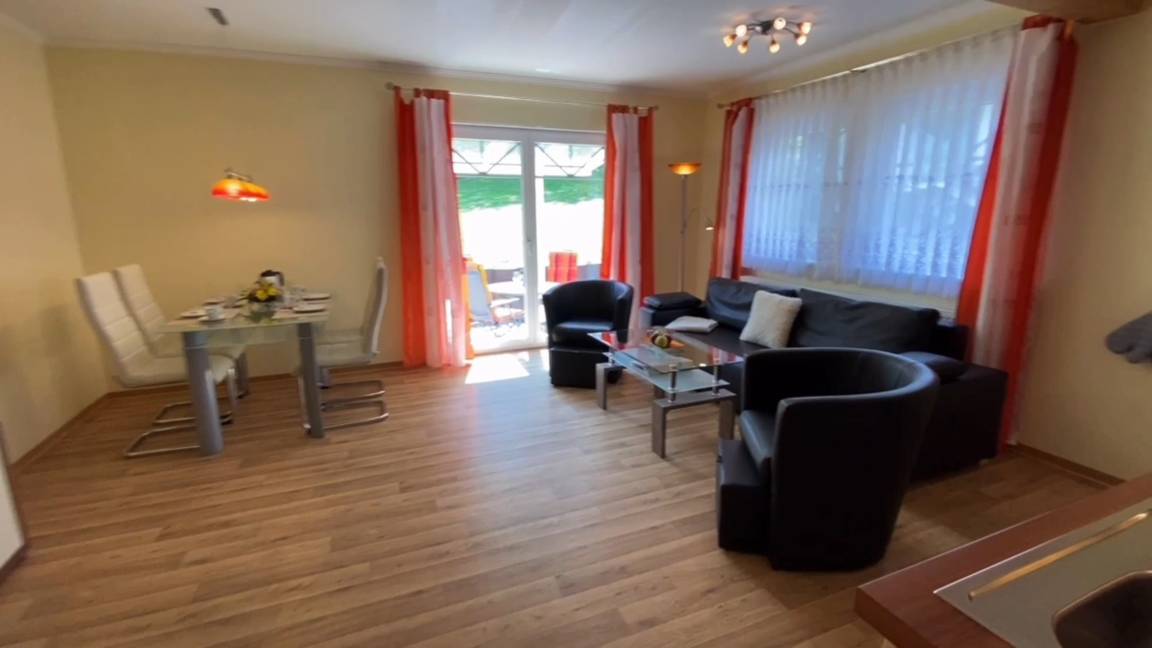 Die einladende 2-Zimmer Ferienwohnung im Haus Wiesengrund ist stilvoll und modern eingerichtet und bietet ein freundliches Zuhause für die schönste Zeit des Jahres, Ihre Ferien oder Ihren Urlaub. Die Ferienwohnung ist von Deutschen Tourismusverband mit 4 Sternen ausgezeichnet worden. Bitte beachten Sie, daß im Haus Wiesengrund das Rauchen in der Unterkunft nicht erwünscht ist. Die 2-Zimmer Wohnung bietet mit ihren ca. 59 m² viel Platz für bis zu 4 Personen. Auf der Terrasse finden Sie je nach Tageszeit immer ein ruhiges Plätzchen zum Frühstücken oder für ein entspanntes Sonnenbad. Von der Terrasse blicken Sie auf die direkt angrenzende saftig grüne und malerisch hügelige Wiesenlandschaft. Die offene Wohnküche lässt kaum Wünsche offen: ein Cerankochfeld, eine Mikrowelle mit Grillfunktion, die Spülmaschine und der Kühlschrank mit Eisfach erleichtern das Urlaubsleben. Diese Fewo bietet ein komfortables Duschbad. Bei der Wohnung ist der großzügig geschnittenen Wohnraum neben einem bequemen Sofa mit Kabel-TV und DVD-Player sowie mit einer kleinen Stereoanlage ausgestattet. In der 2-Zimmer Wohnung finden Sie ein separates Schlafzimmer mit Doppelbett. Bei der Wohnung ist die Couch im Wohnzimmer mit wenigen Handgriffen in einen bequemen Schlafplatz 140cm x 200cm für 2 weitere Personen verwandelt. Von unserer Ferienanlage Mönchgut ist es nur ein kurzer Fußmarsch von ca 150m bis zum Strand und der Ostsee.