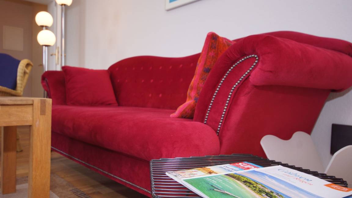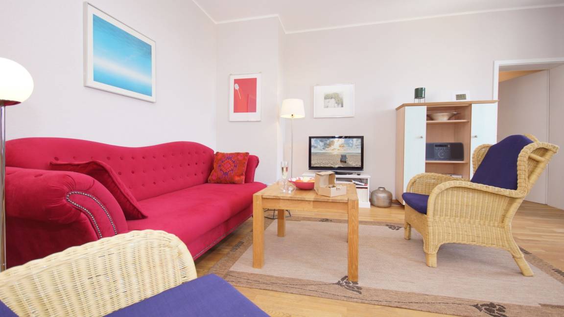 Der freundliche Wohnbereich bietet einen gemütlichen Ort zum Ausklingen der erlebnisreichen Tage auf Rügen. Hier befindet sich neben einem modernen Flachbild-TV auch eine komfortable Couchgarnitur. Vom Wohnbereich aus können Sie auch ein einen tollen Ausblick auf die Göhrener Ostsee genießen!