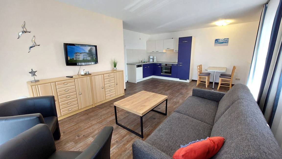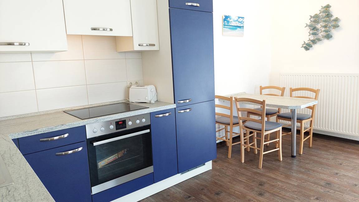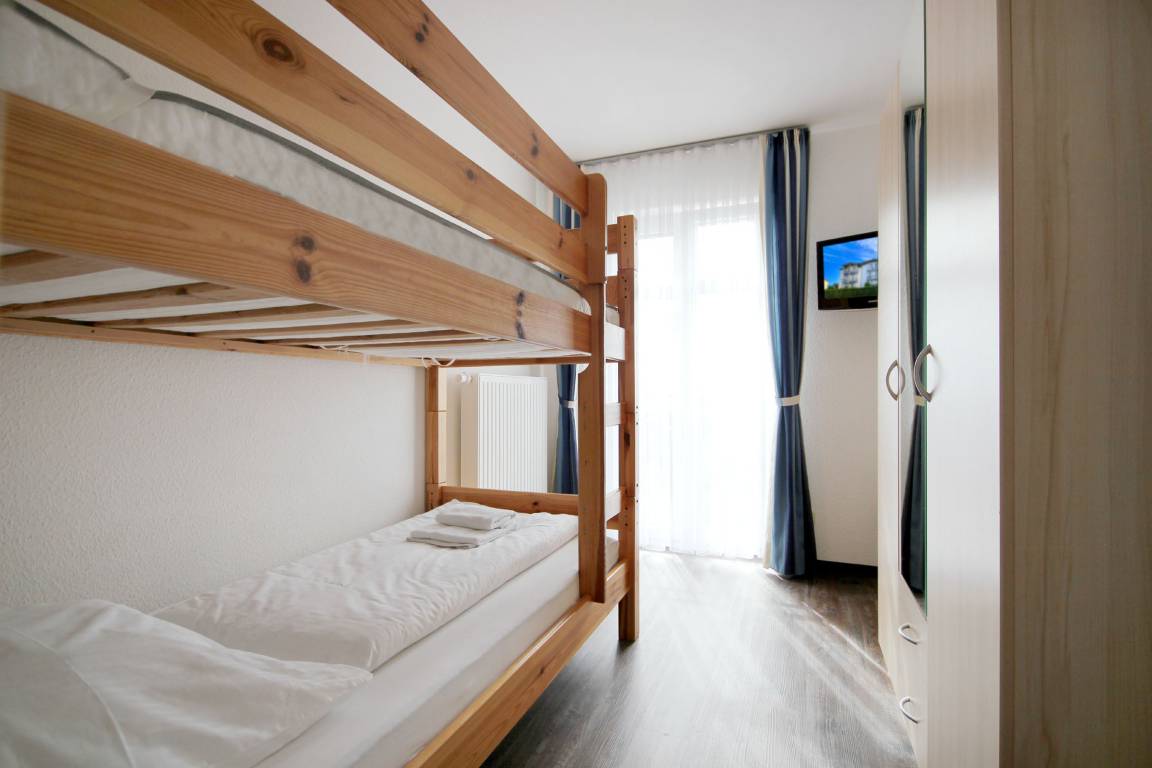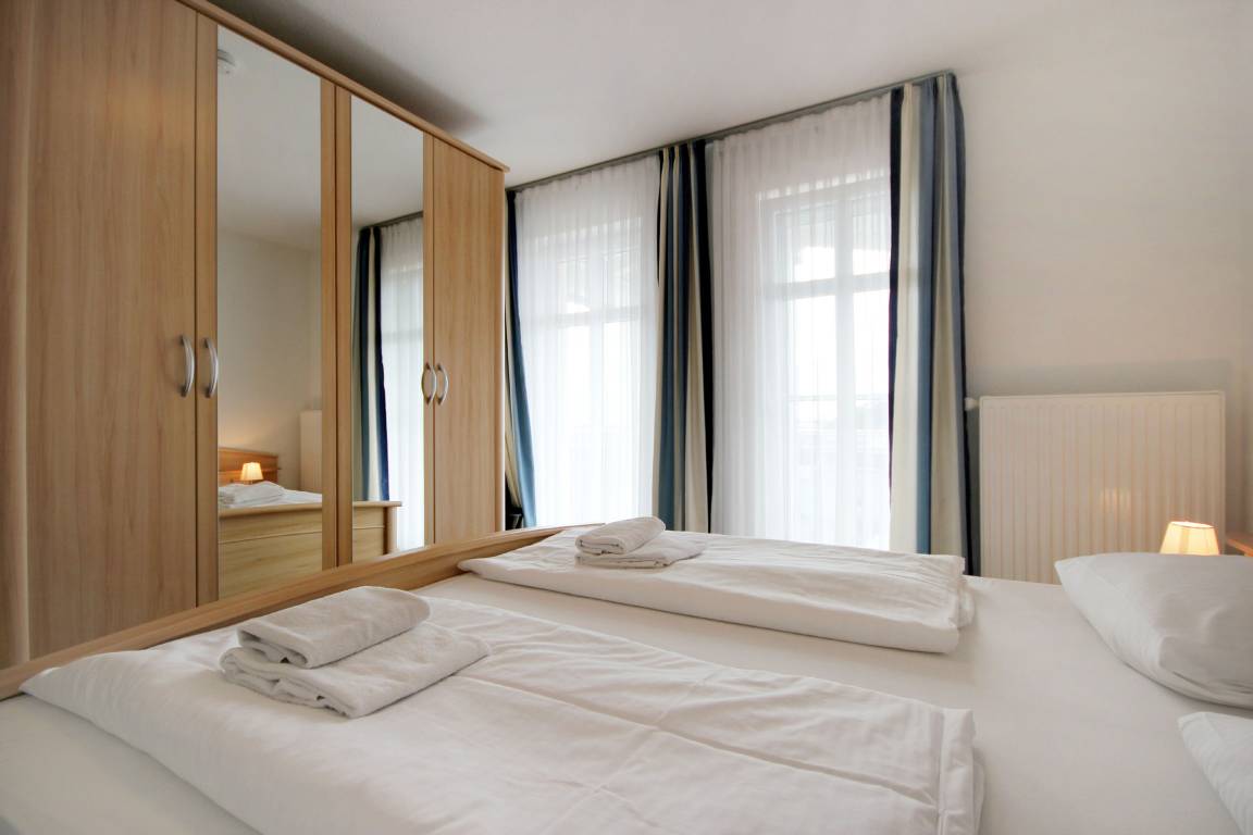 Diese freundliche Wohnung ist aufgeteilt in einen Wohnraum mit Balkon und integrierter Küchenzeile, zwei Schlafzimmer und ein Bad mit Dusche, Waschtisch und WC. Das Wohnzimmer begrüßt Sie mit einem Schlafsofa und Sessel sowie Flachbild-TV. Das Hauptschlafzimmer verfügt über ein Doppelbett (1,80m x 2m), zusätzlichem Balkon sowie einen Kleiderschrank. Der zweite Schlafraum begrüßt Sie mit einem Etagenbett, Kleiderschrank und TV. Die Küchenzeile ist mit Backofen, Geschirrspüler, Cerankochfeld, Kühlschrank mit kleinem Gefrierfach, Cerankochfeld, Mikrowelle, Kaffeemaschine, Wasserkocher und Toaster ausgestattet. Highlights: Kostenfreies WLAN sowie ein frei wählbarer PKW-Stellplatz direkt am Haus. Haustiere sind in dieser Wohnung herzlich willkommen.