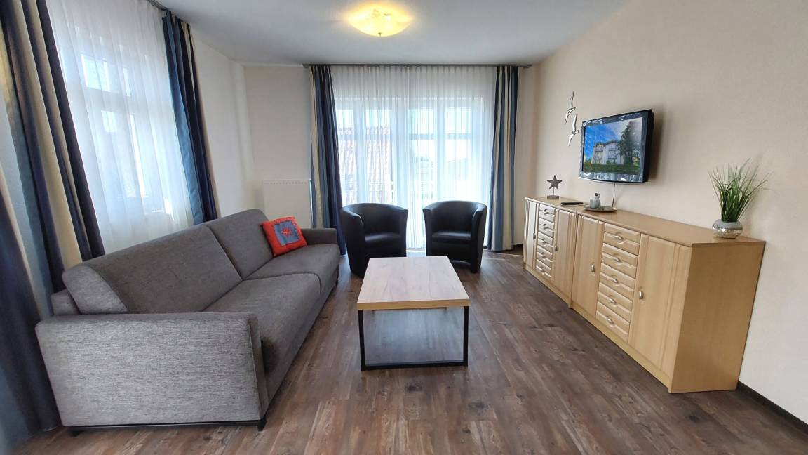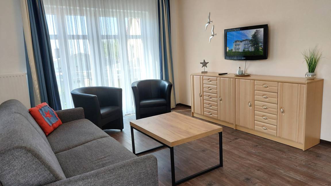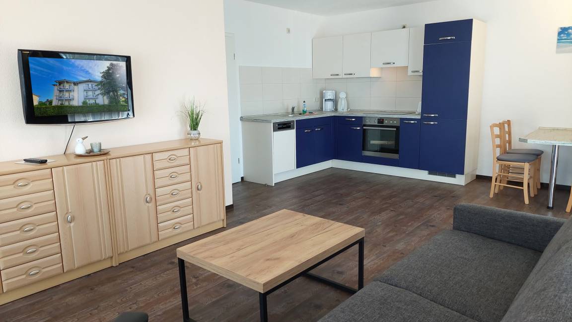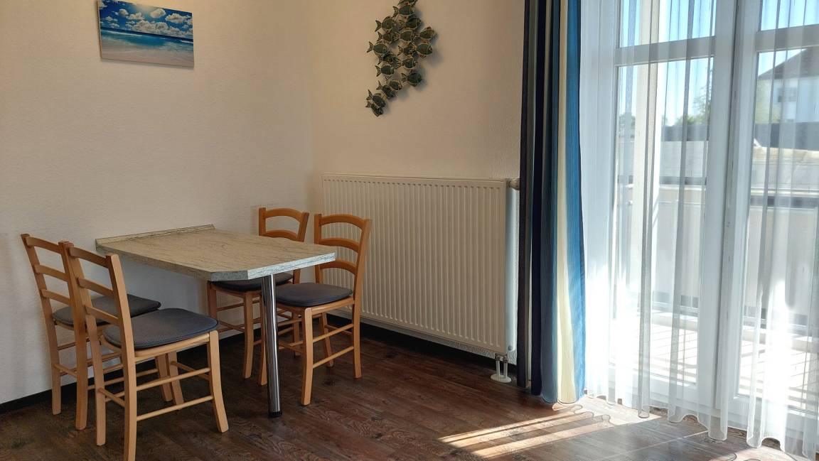 Diese freundliche Wohnung ist aufgeteilt in einen Wohnraum mit Balkon und integrierter Küchenzeile, zwei Schlafzimmer und ein Bad mit Dusche, Waschtisch und WC. Das Wohnzimmer begrüßt Sie mit einem Schlafsofa und Sessel sowie Flachbild-TV. Das Hauptschlafzimmer verfügt über ein Doppelbett (1,80m x 2m), zusätzlichem Balkon sowie einen Kleiderschrank. Der zweite Schlafraum begrüßt Sie mit einem Etagenbett, Kleiderschrank und TV. Die Küchenzeile ist mit Backofen, Geschirrspüler, Cerankochfeld, Kühlschrank mit kleinem Gefrierfach, Cerankochfeld, Mikrowelle, Kaffeemaschine, Wasserkocher und Toaster ausgestattet. Highlights: Kostenfreies WLAN sowie ein frei wählbarer PKW-Stellplatz direkt am Haus. Haustiere sind in dieser Wohnung herzlich willkommen.