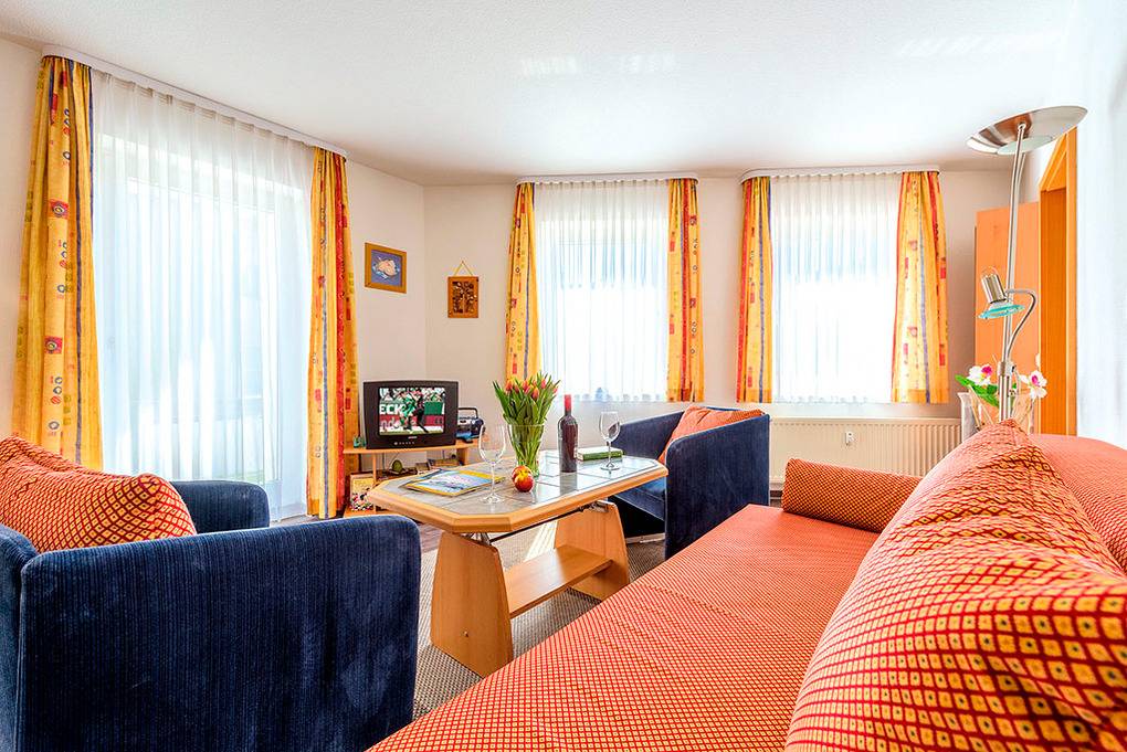 D 93.57 Wohnung 2-4 Pers.: Freundliche 2-Zimmerwohnung, 45 qm Wohnfläche, 1. Etage. Wohn-/Schlafraum mit Couchgarnitur (Ausziehcouch 2 Pers.), Esstisch, Küchenzeile mit Backofen. Doppelzimmer. Bad/WC. Balkon mit Sitzmöbeln.