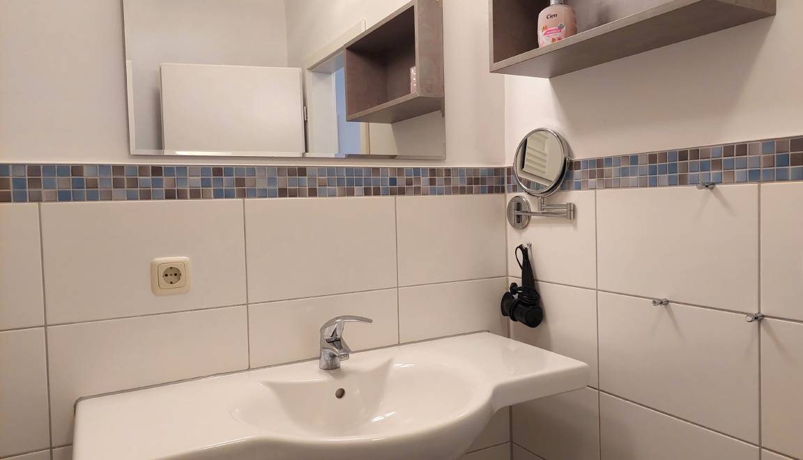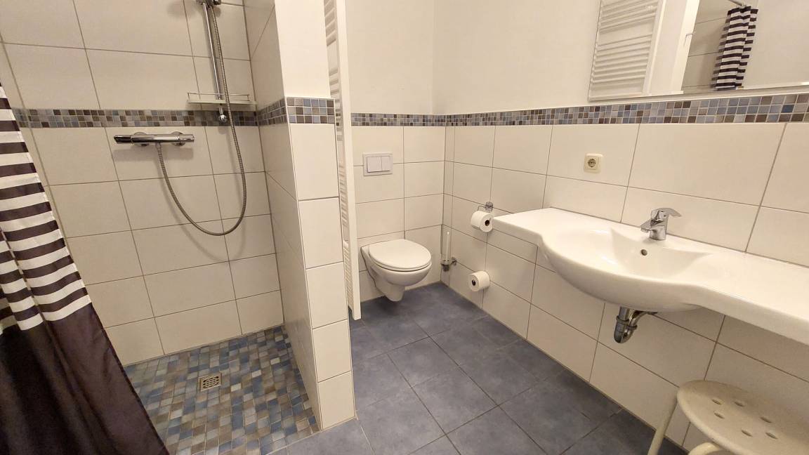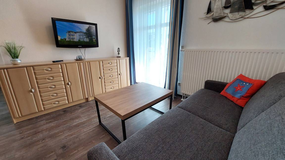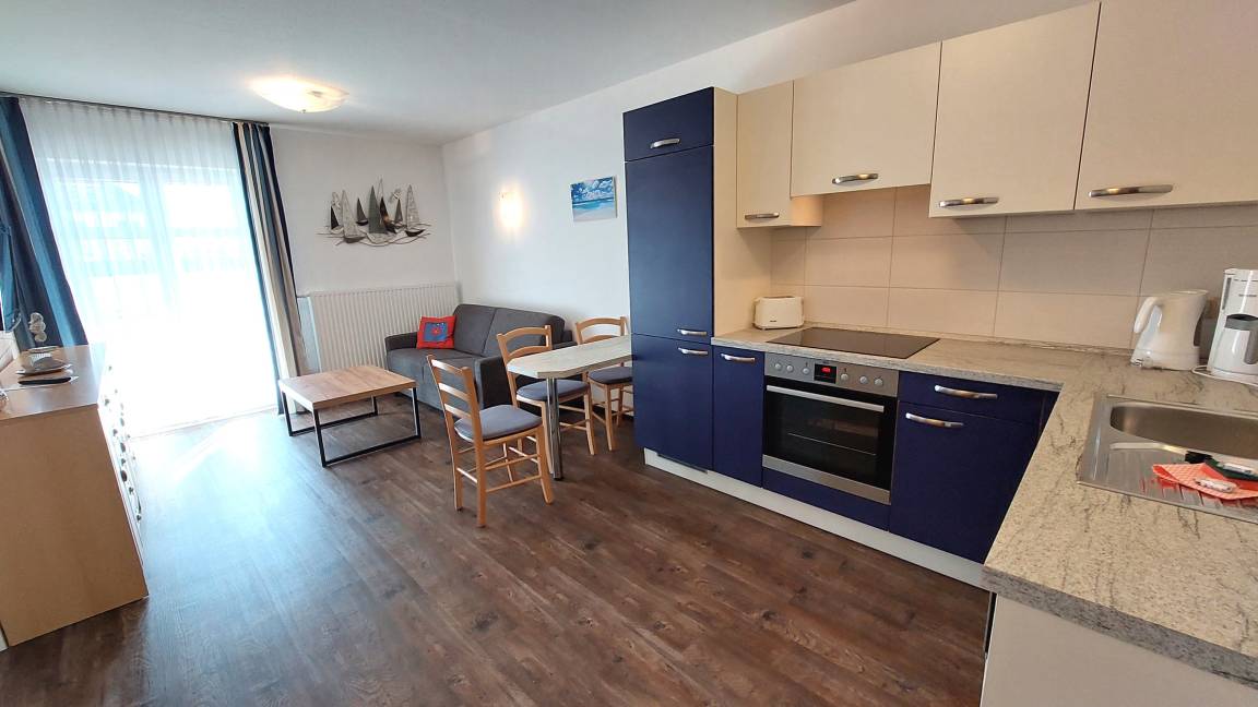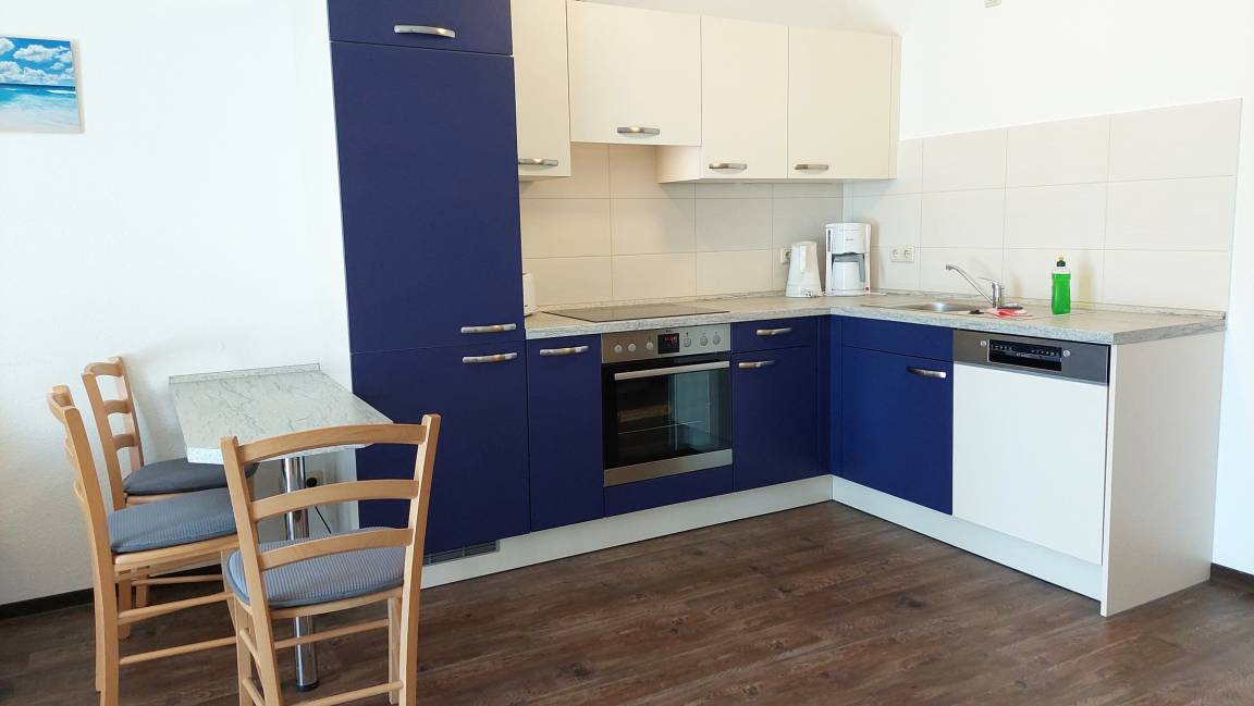 Diese freundliche Wohnung ist aufgeteilt in einen Wohnraum mit Balkon und integrierter Küchenzeile, ein Schlafzimmer ebenso mit Zugang zum Balkon und ein Duschbad mit Waschtisch und WC. Das Wohnzimmer begrüßt Sie mit einem Schlafsofa und Sessel sowie Flachbild-TV. Das Schlafzimmer verfügt über ein Doppelbett (1,80m x 2m) sowie einen Kleiderschrank. Die Küchenzeile ist mit Backofen, Geschirrspüler, Cerankochfeld, Kühlschrank mit kleinem Gefrierfach, Cerankochfeld, Mikrowelle, Kaffeemaschine, Wasserkocher und Toaster ausgestattet. Highlights: Kostenfreies WLAN sowie ein frei wählbarer PKW-Stellplatz direkt am Haus.
