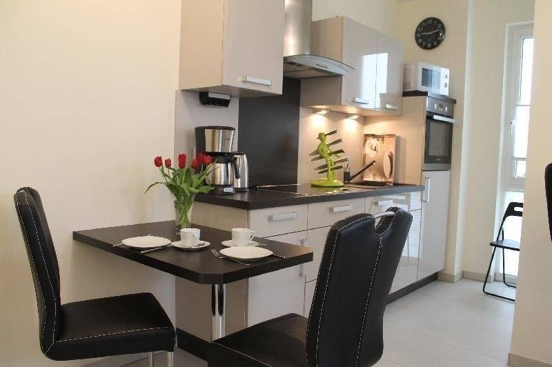 Die Wohnung hat ein Wohnzimmer mit einem Schlafsofa und ein separates Schlafzimmer mit einem Doppelbett. Darin sind Verdunklungsrollos für einen ruhigen Schlaf vorhanden. Die Küche ist vollwertig eingerichtet, sie verfügt u.a. über eine Geschirrspülmaschine, einen Herd, einen Backofen, einen Kühlschrank mit Gefrierteil, eine Mikrowelle, Kaffeemaschine, Toaster, Wasserkocher sowie einen reichhaltigen Bestand an Geschirr, Gläsern und Besteck. Im Badezimmer befindet sich eine Glas-Dusche, Fön und Kosmetikspiegel.