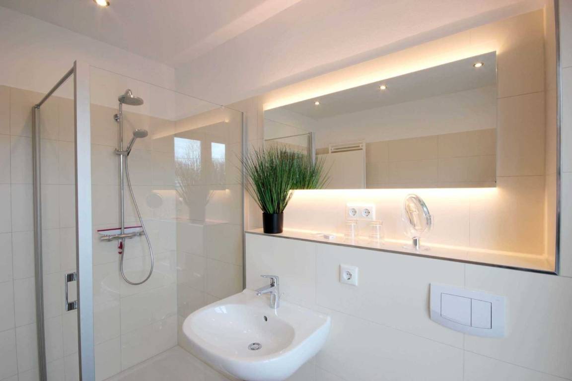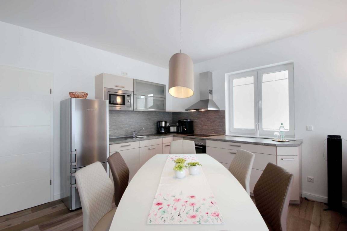 Im EG befindet sich der Wohnbereich mit einer großzügigen Sitzgruppe, Kamin sowie die moderne Küche und der Essbereich. Zur technischen Ausstattung im Wohnraum zählt ein Flachbildfernseher (65-Zoll) und der kostenfreie Internetzugang. Die Küche ist mit Backofen, Cerankochfeld, Mikrowelle, Geschirrspülmaschine, Kühl-/Gefrierkombination, Kaffeevollautomat, Wasserkocher, Toaster und diversen anderen Küchenhelfern komplett ausgestattet. Darüber hinaus gibt es Tageslicht-Duschbad mit Waschtisch, Waschmaschine und WC.