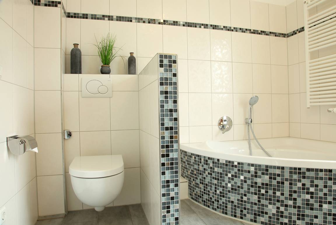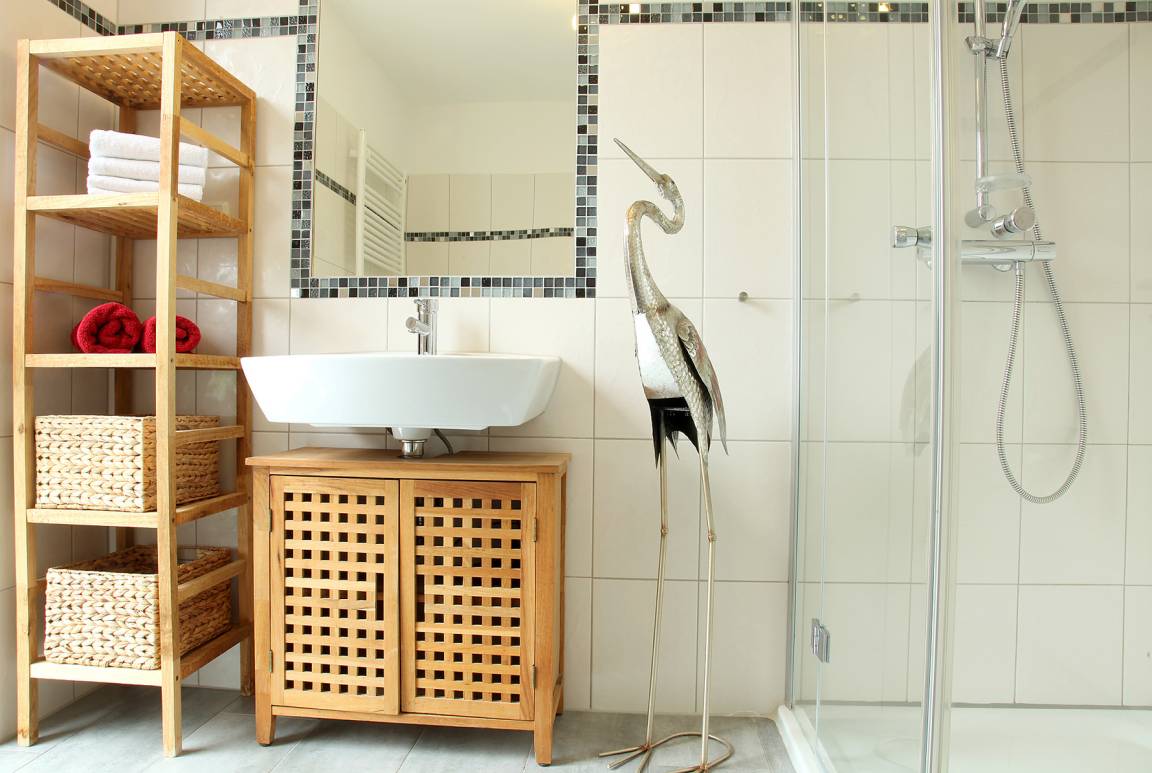 Die umfangreiche Ausstattung beinhaltet eine Spülmaschine und einen Kühlschrank mit Gefrierfach. Zudem einen Backofen mit Cerankochfeld, Mikrowelle, Kaffeemaschine und zusätzlich eine Senseo-Pad-Maschine, Wasserkocher, Toaster, ausreichend Geschirr, Gläser, Besteck, Töpfe und Pfannen.