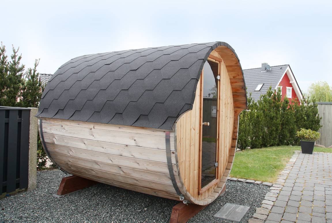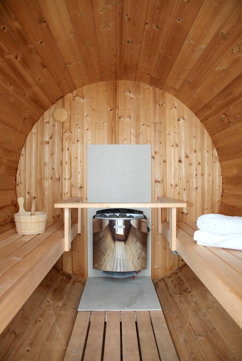 Obendrein findet man im Garten eine kleine Wellness-Oase zum Relaxen. Die Fass-Sauna ist genau das Richtige zum Entspannen nach einem schönen Ausflug mit den Liebsten.