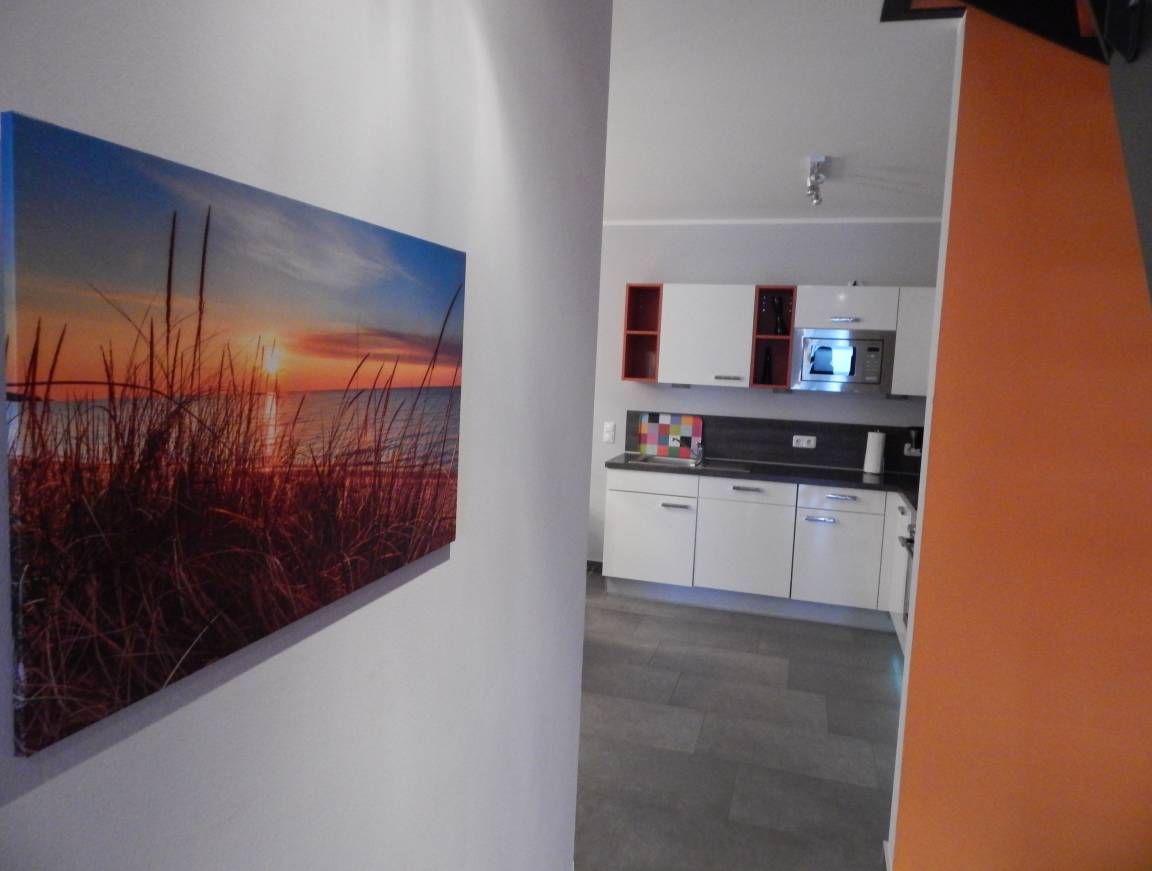 Die in diesem Raum optimal integrierte, moderne weiße Hochglanz-Design-Küche mit hochwertiger Ausstattung (Umluftherd, 4-Zonen-Cerankochfeld, Mikrowelle, Spülmaschine, Kühl-/Gefrierschrank, ausreichend Geschirr, Gläser, Besteck, Kochtöpfe sowie viele nützliche Kochutensilien) freut sich auf Sie!