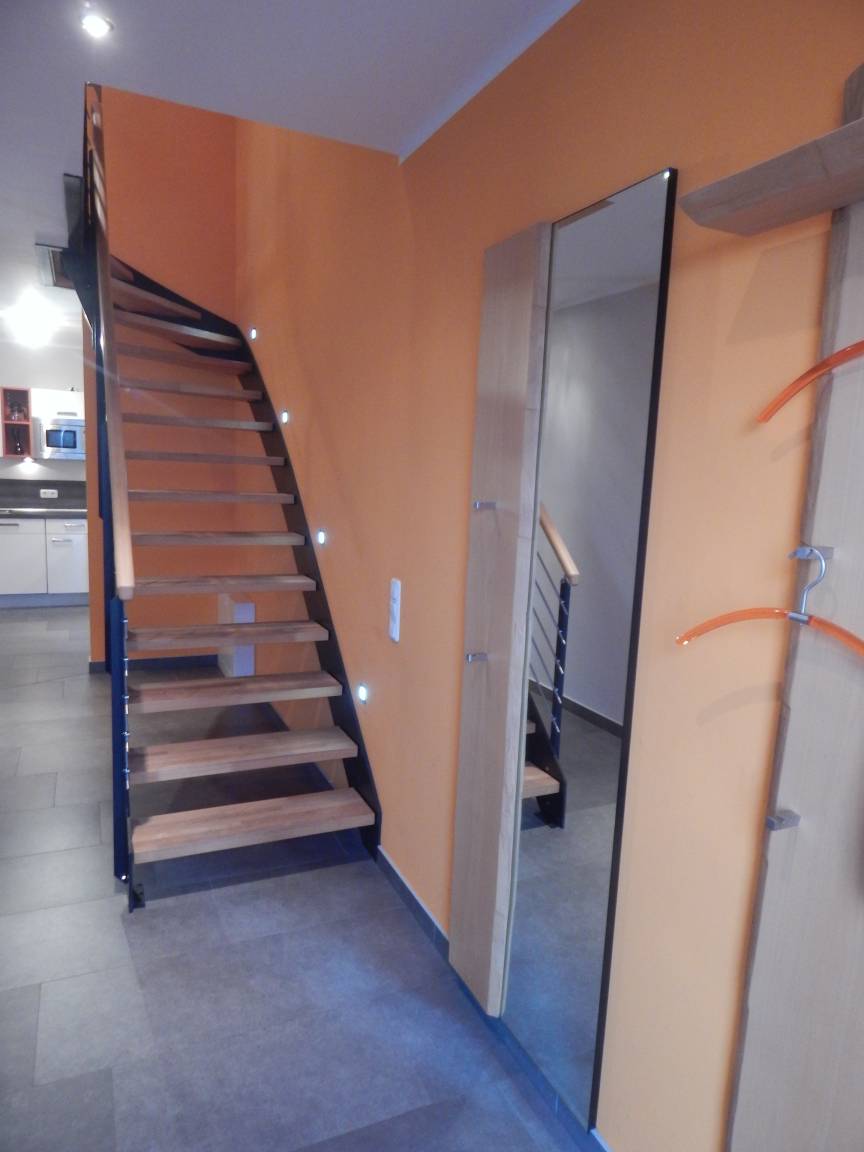 Eine hochwertige Designtreppe führt in das ebenfalls geräumige Obergeschoss. Hier befinden sich 2 weitere Wohlfühl-Schlafzimmer & & 1 Wellness-Bad mit Sauna.