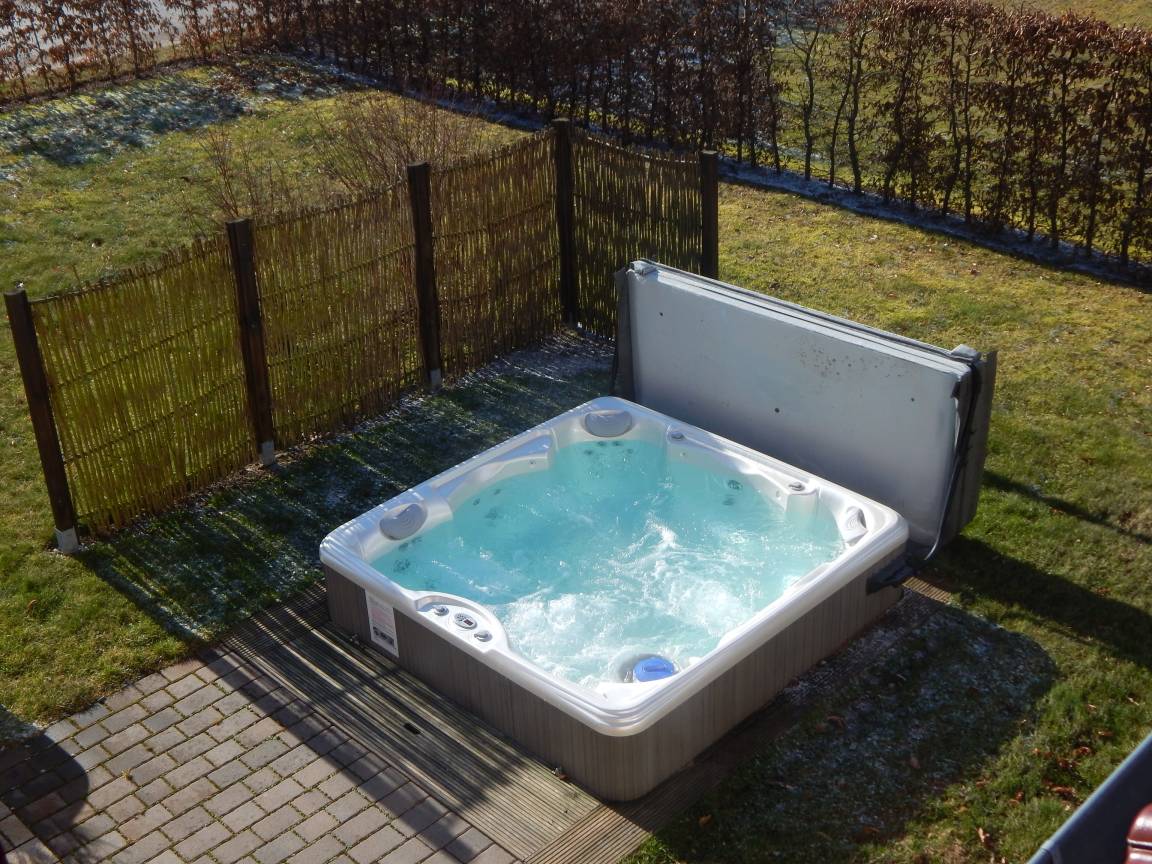 Die Süd-Terrasse grenzt am Wohnbereich, wir haben sie ausgestattet mit Grill & den sich anschließenden eigenen, großen Garten. Hier entspannen Sie ganzjährig im 38 ° C beheizten, hauseigenen Außenwhirlpool mit sprudelndem Massagegenuss aus den Hydro-Massagejet-Düsen. Die im Pool integrierten, dimmbaren Multi-LED-Lämpchen mit wechselndem Farbenspiel lassen zu jeder Jahreszeit Ihren Urlaubstag mehr als entspannt ausklingen.