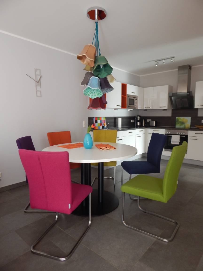 Der Esstisch mit hochwertigen, bunten 6 Schwingstühlen lädt zum gemeinsamen Beisammensein ein. Ein Kinderhochstuhl ist kostenfrei im Ferienhaus.