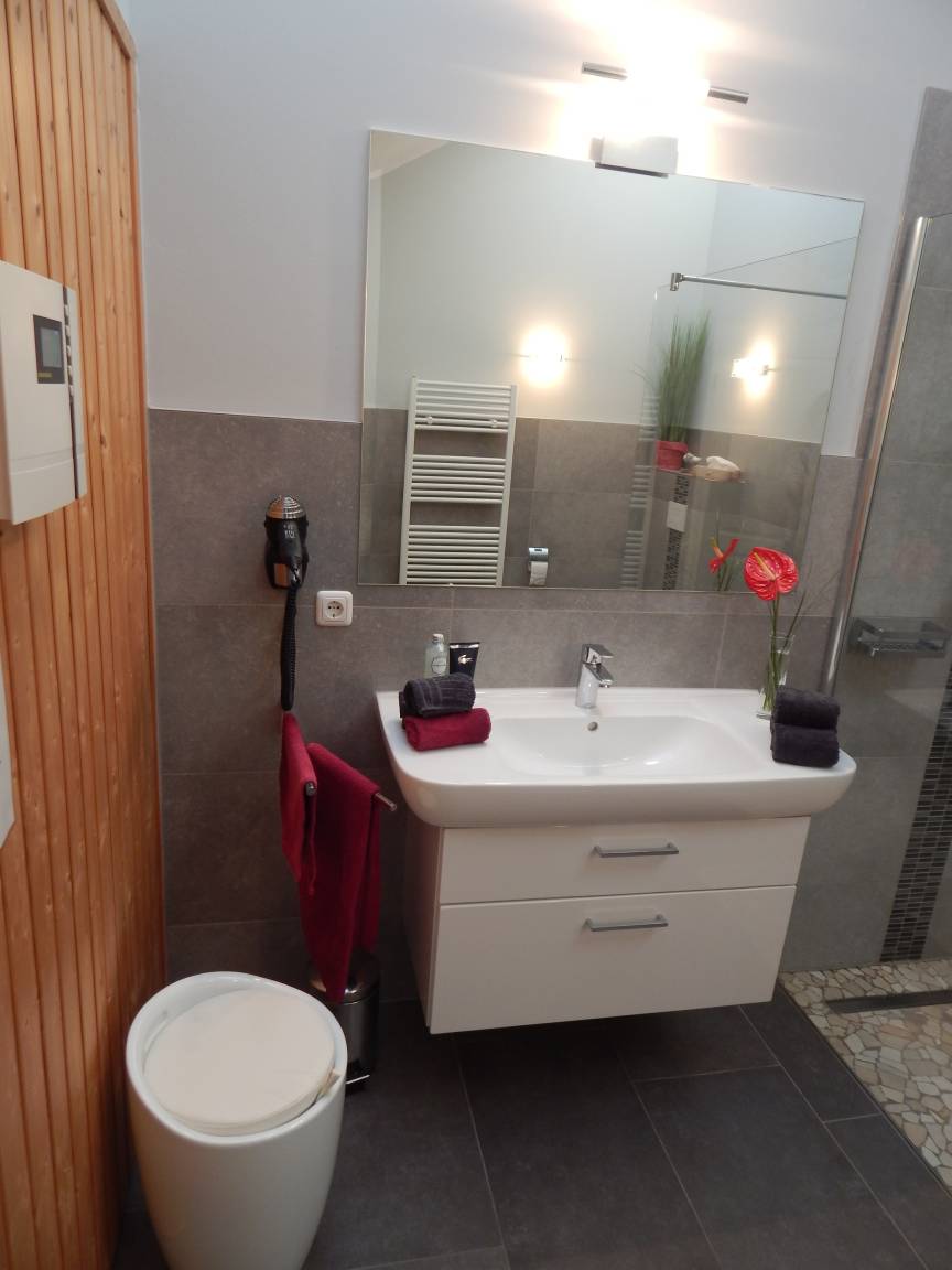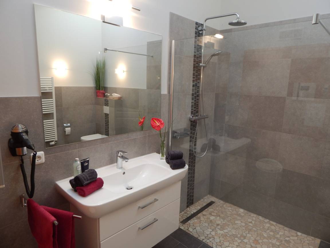 * 2 Luxus Bäder mit bodengleichen, verglasten Wellness-Duschen und WC, Föne, Radio mit iPod Station