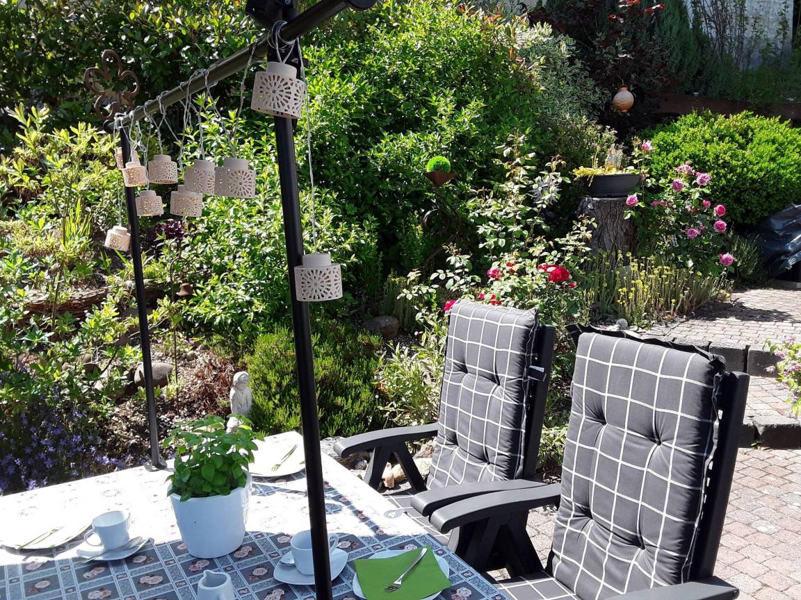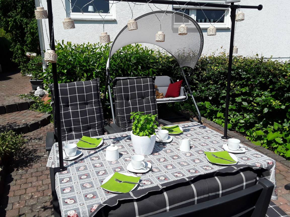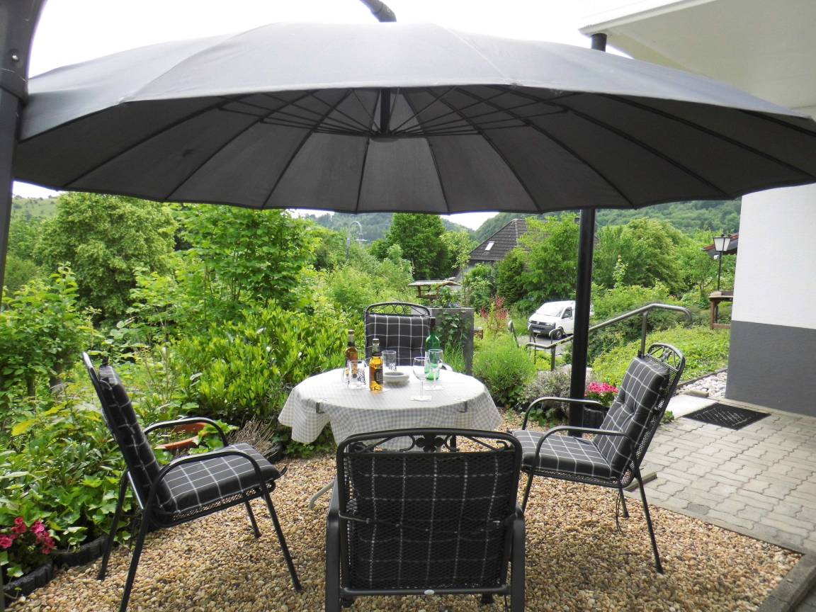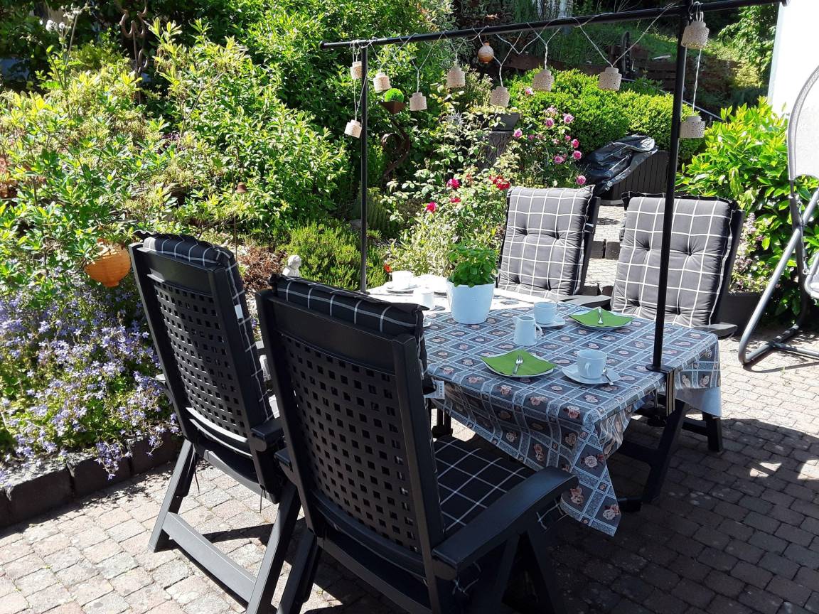 Verfügung stehen. Die Terrassen bieten Ihnen eine Sitzgelegenheit mit Auflagen, sowie einen Sonnenschutz ( Ampelschirm ) . Kostenloser Parkplatz vor der Ferienwohnung.