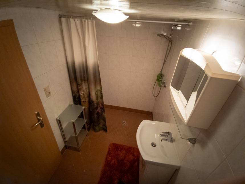 Von der Wohnküche aus betreten Sie das Badezimmer mit einer Dusche, dem WC und einem Waschbecken.