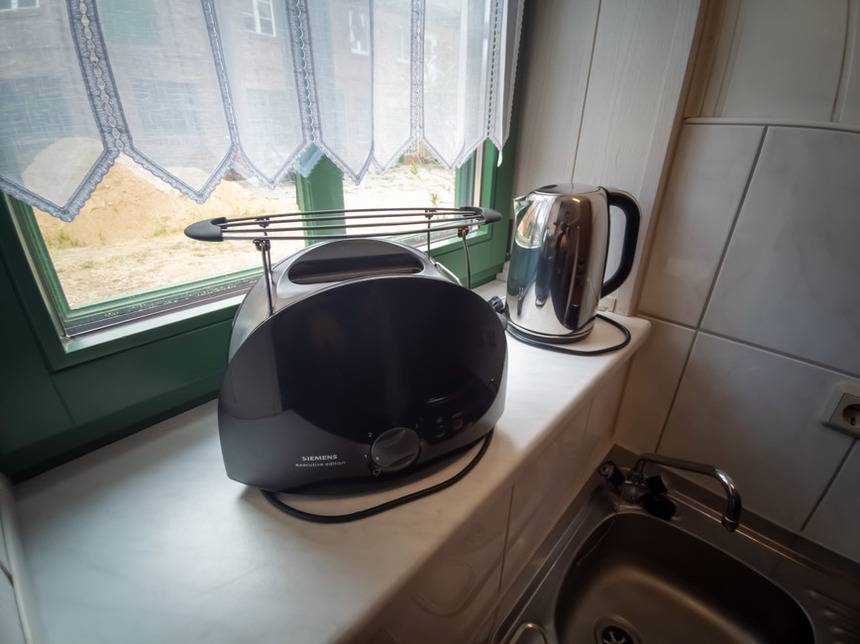 Sie betreten die Wohnung ebenerdig in die Wohnküche. Hier befindet sich ein Esstisch mit Stühlen und einer Sitzecke. Die Treppe führt ins Schlafzimmer. Die Küchenzeile ist mit 2 Kochplatten, einem Spülbecken, einem Kühlschrank mit Gefrierfach, einer Kaffeemaschine, einem Toaster und einem Wasserkocher ausgestattet.